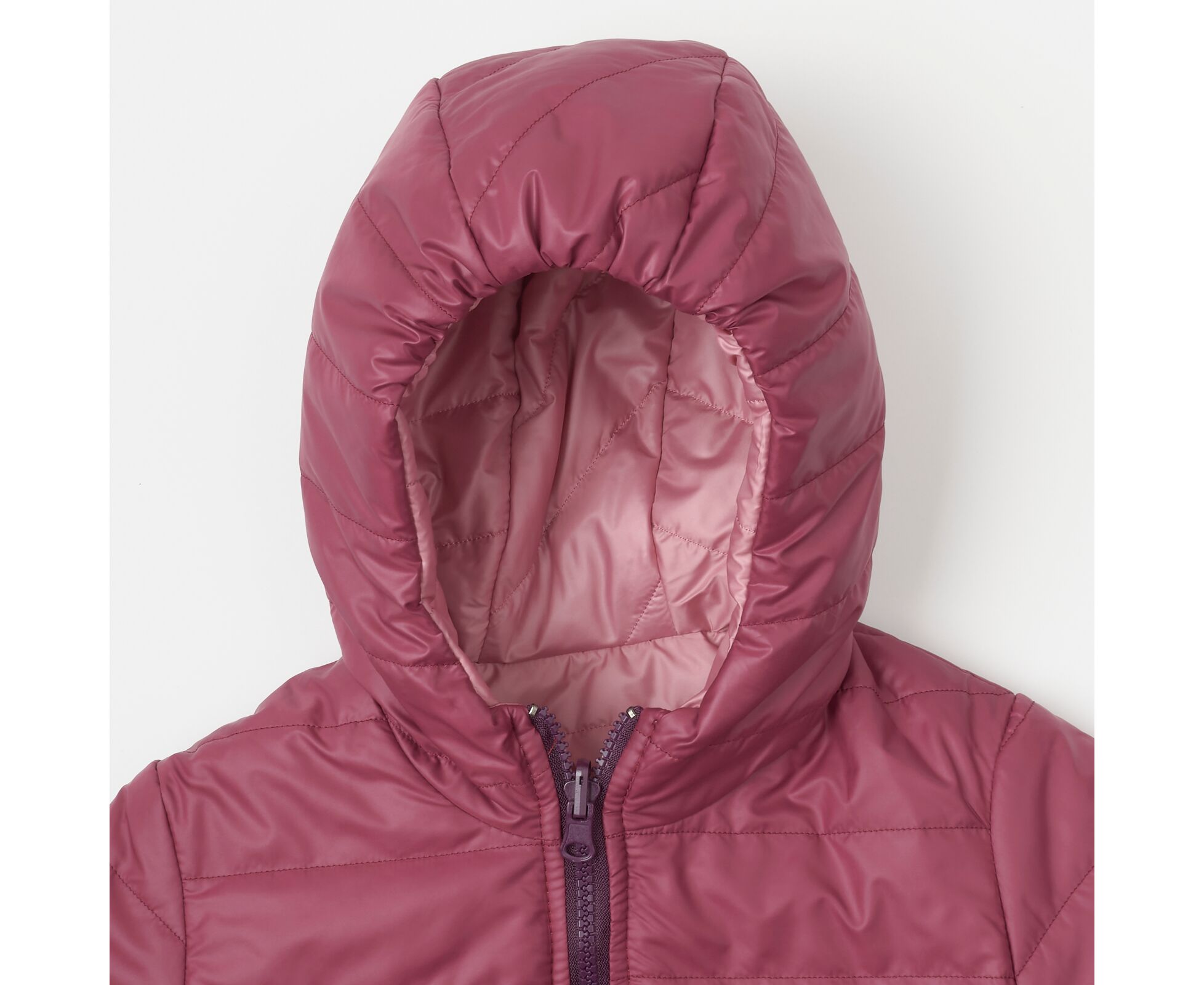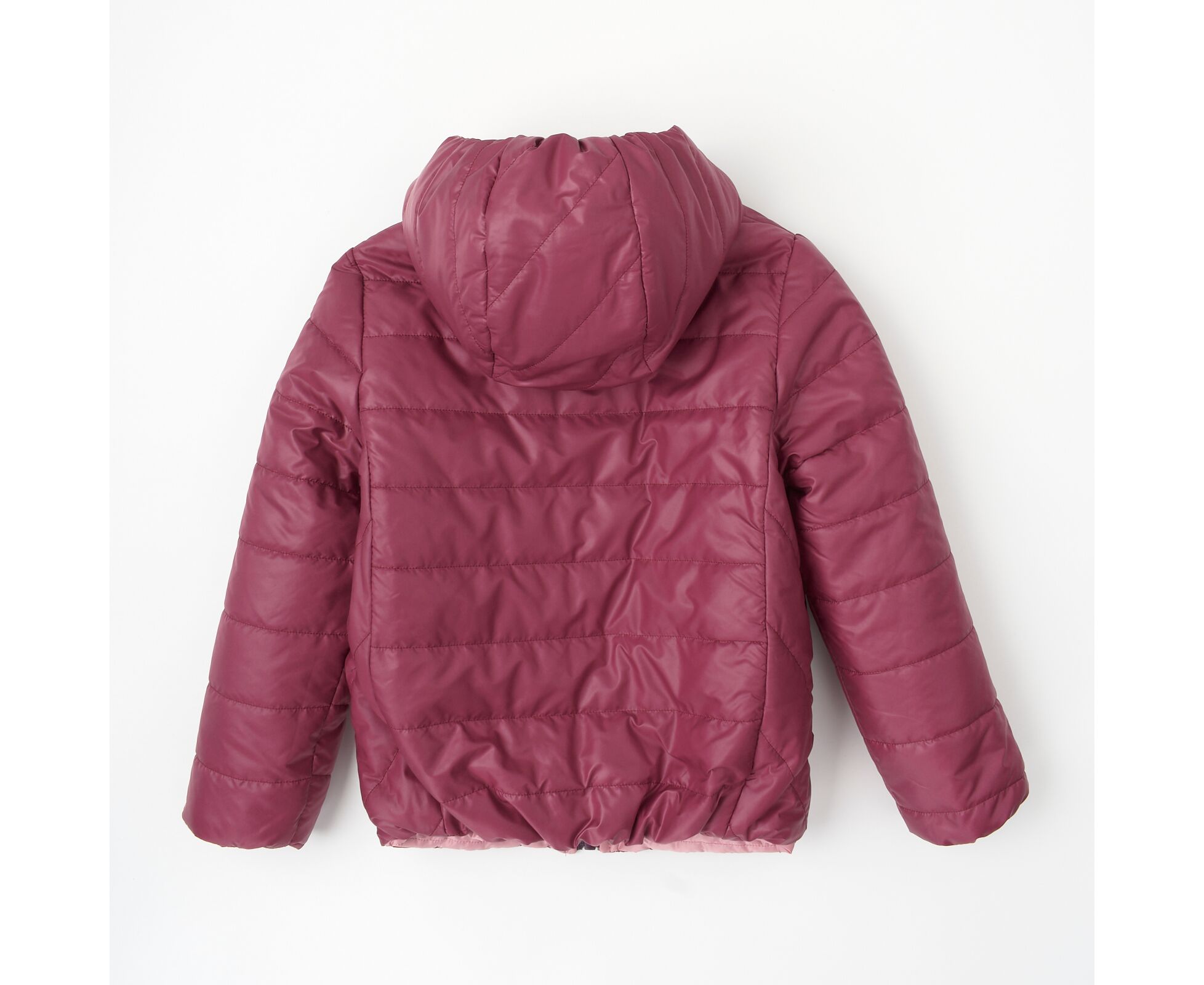Стильна двостороння куртка з каптуром, з плащовки лаке, стьбаної з м'яким утеплювачем (синтепух щільність 120г/кв.м.), який добре зберігає форму та об'єм, навіть після багаторазового стиснення. Кишені в рел'єфних швах на одній та на іншій сторонах куртки, які мають контрасний колір ,що дає можливість виглядати по-різному, маючи тільки одну річ. Центральна двостороння застібка - блискавка з перекидним бігунком. Низ рукавів, них виробу та передній край каптура на еластичній тасьмі, що добре фіксує виріб та забезпечує йому захист від деформації у період експлуатації.