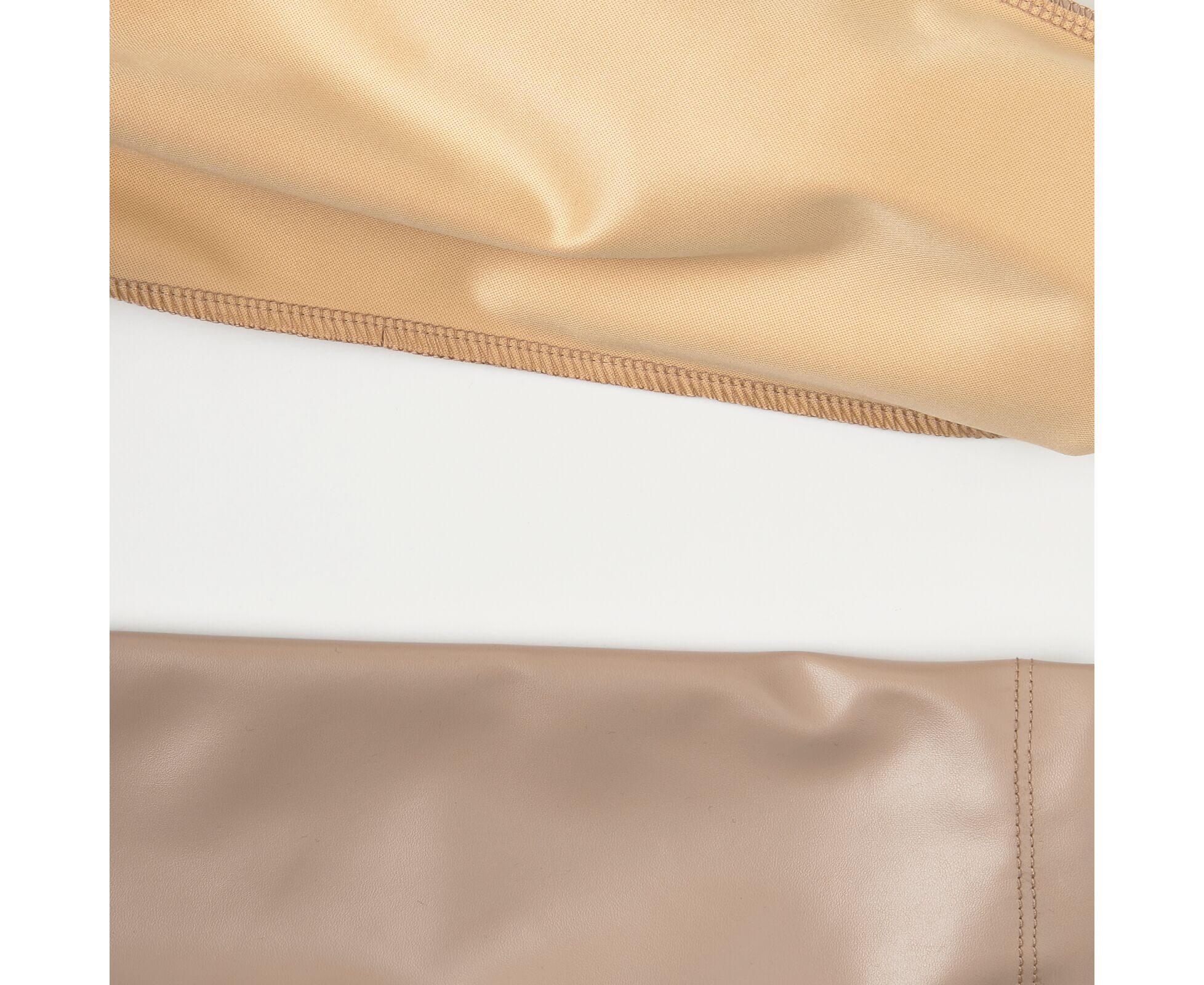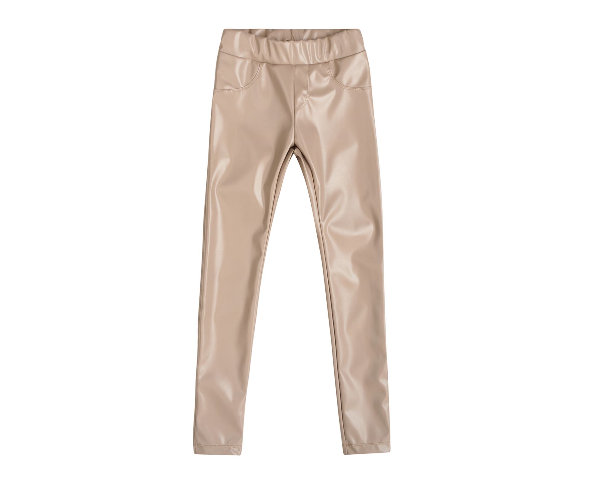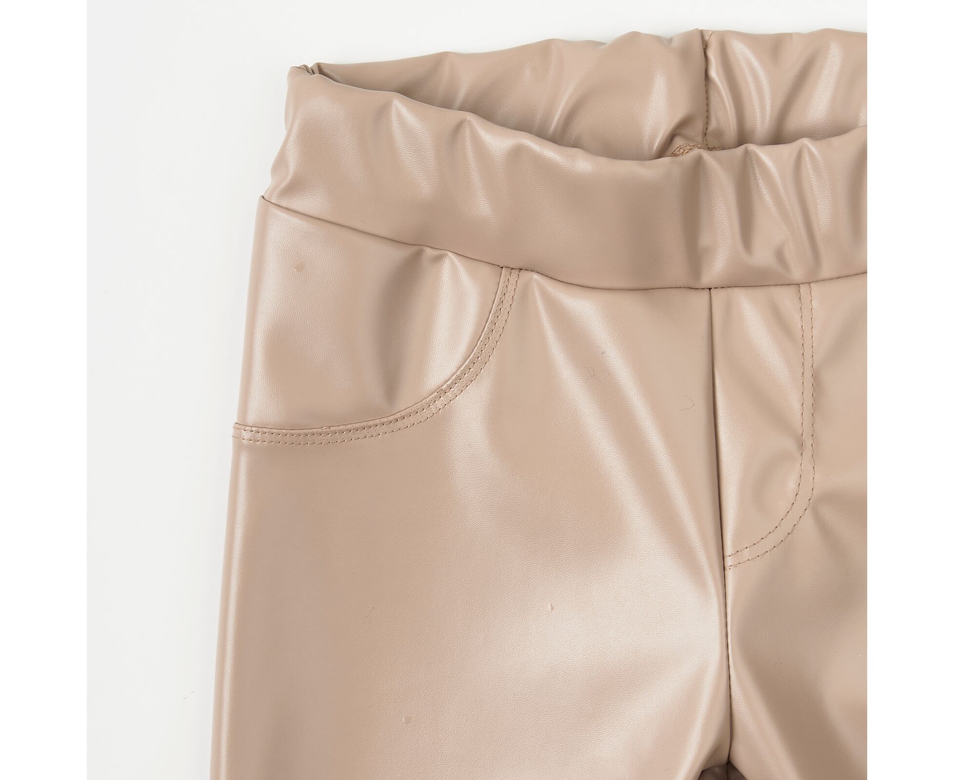 Еластичні лосини з м'якої екокожи. По поясу еластична тасьма. На передніх половинках декоративні строчки, що імітують гульфік та лінії бокових кишень.