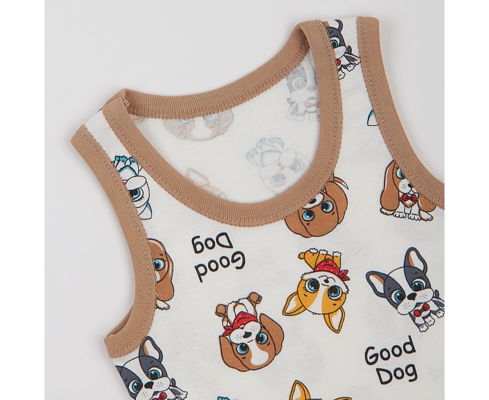 Майка дитяча, з набивної бавовняної рібани без еластану. Пройми та горловина оброблені оздоблювальною бавовняною окантовкою.