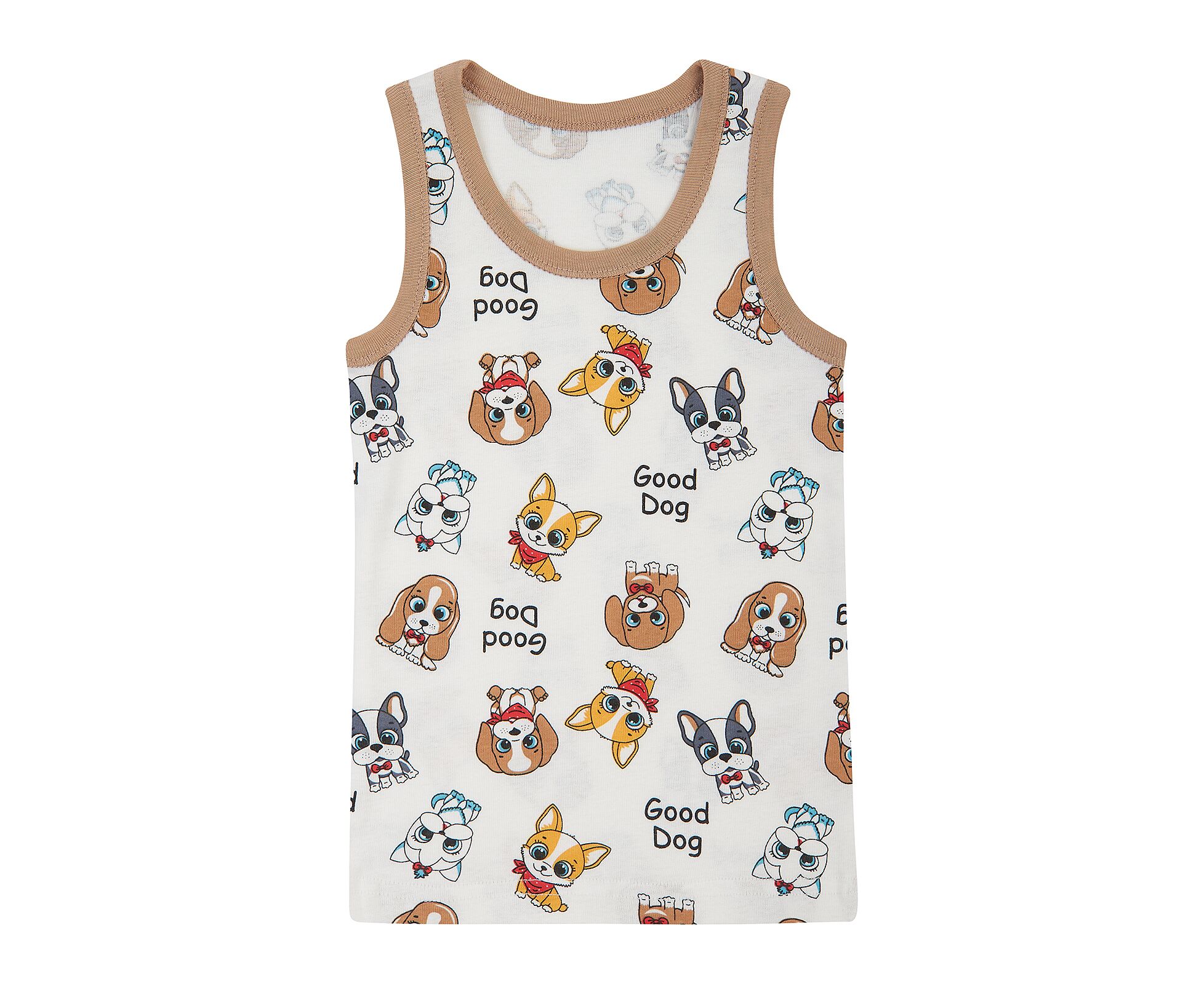 Майка дитяча, з набивної бавовняної рібани без еластану. Пройми та горловина оброблені оздоблювальною бавовняною окантовкою.