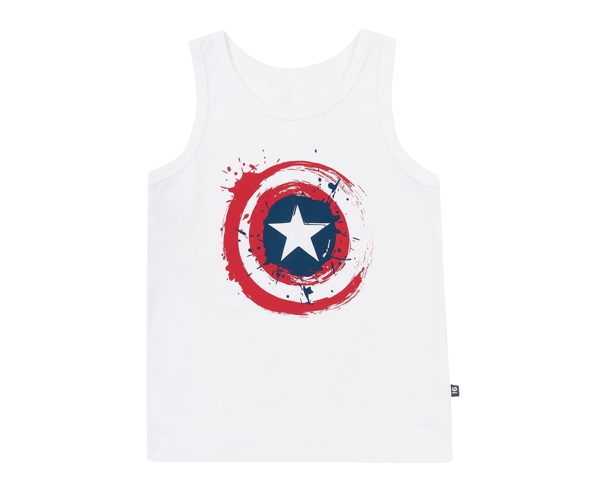 Майка для хлопчика з білого стрейч-куліру (97%бавовна 3%еластан), з друком на переді. Горловина та пройми оброблені рібаною без еластану .