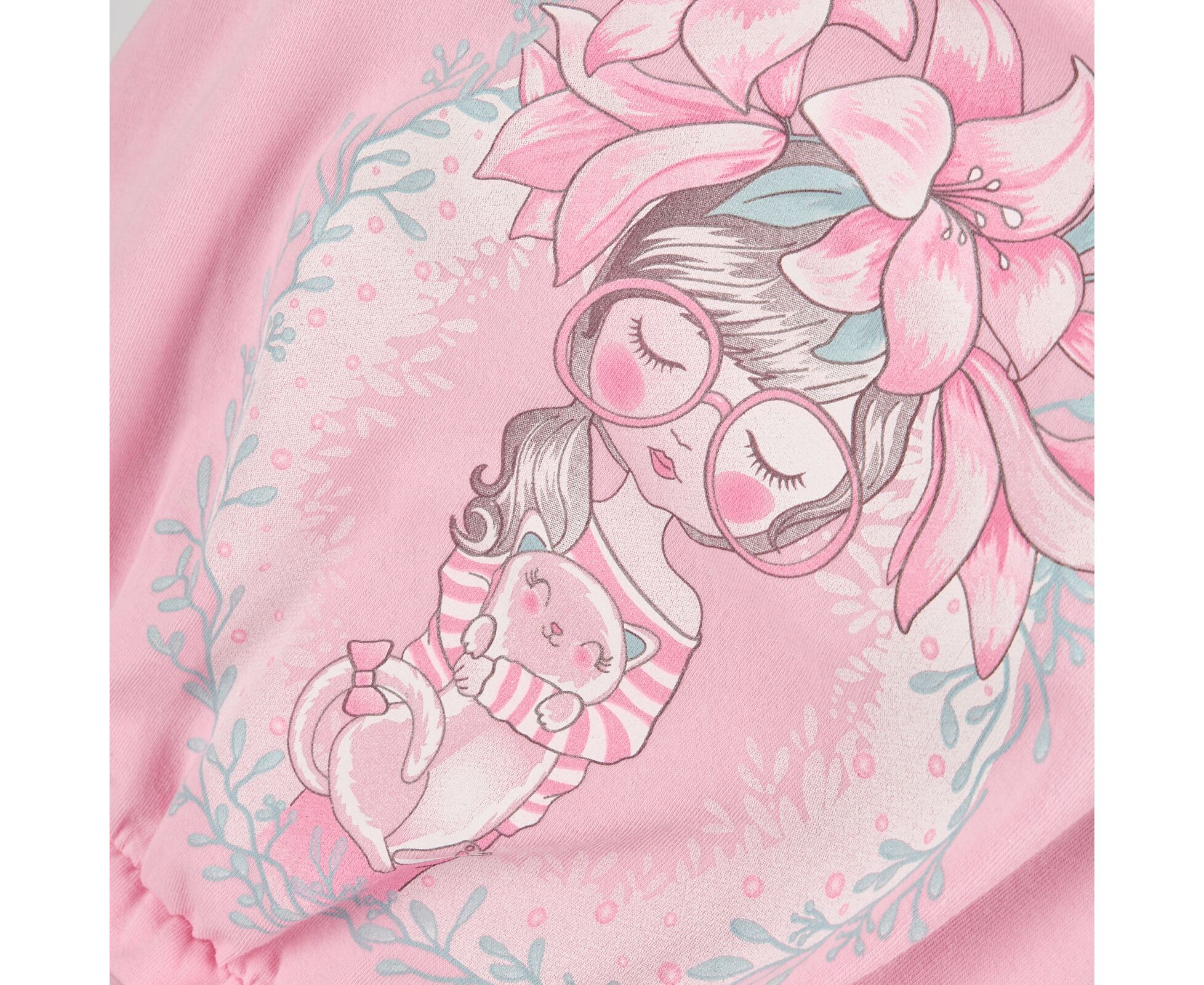 Майка-туніка для дівчинки, з персикового стрейч-куліру з стильним принтом на переді, горловина та пройми окантовані руликом. По низу майки під планкою пришивний рюш з шифону