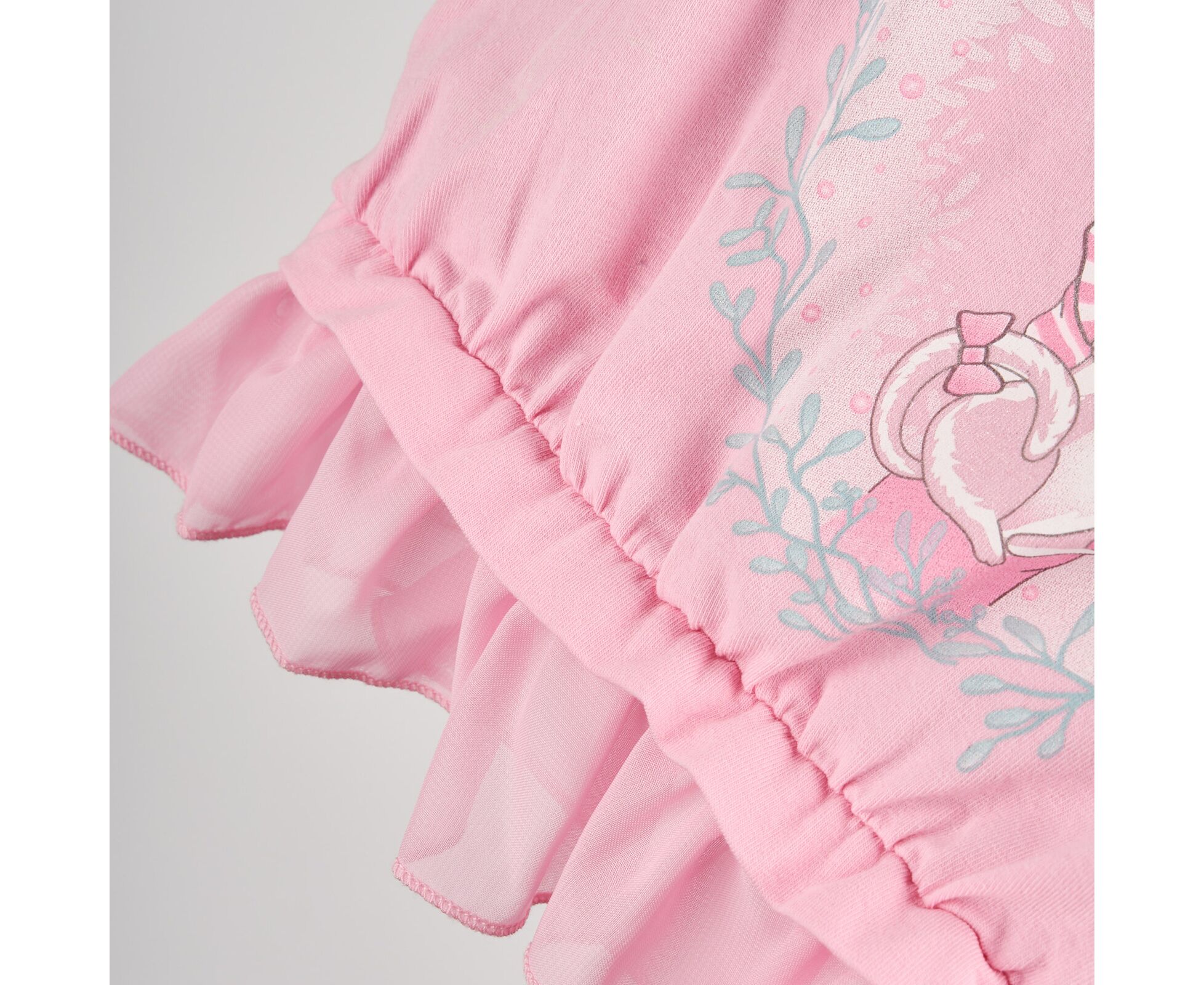 Майка-туніка для дівчинки, з персикового стрейч-куліру з стильним принтом на переді, горловина та пройми окантовані руликом. По низу майки під планкою пришивний рюш з шифону