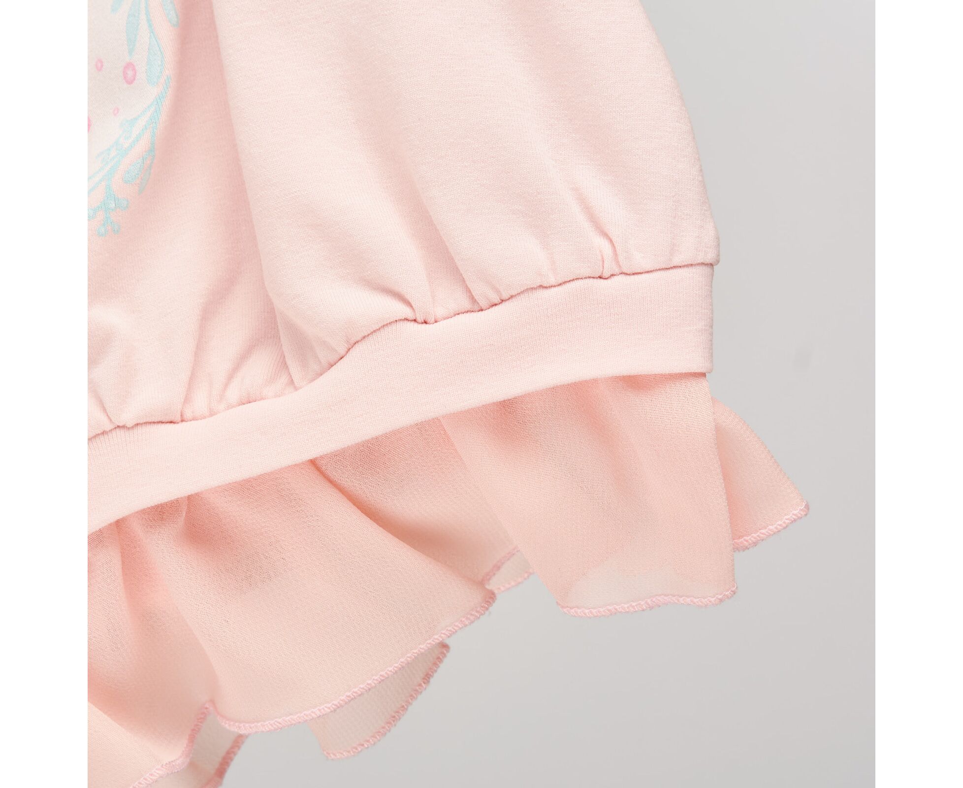 Майка-туніка для дівчинки, з персикового стрейч-куліру з стильним принтом на переді, горловина та пройми окантовані руликом. По низу майки під планкою пришивний рюш з шифону
