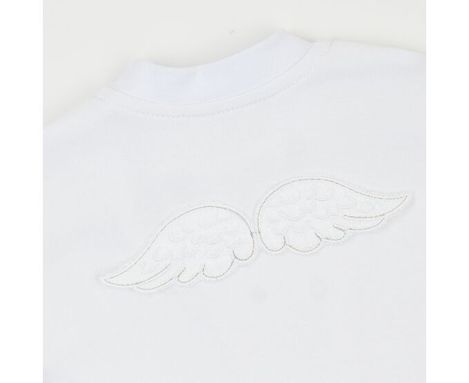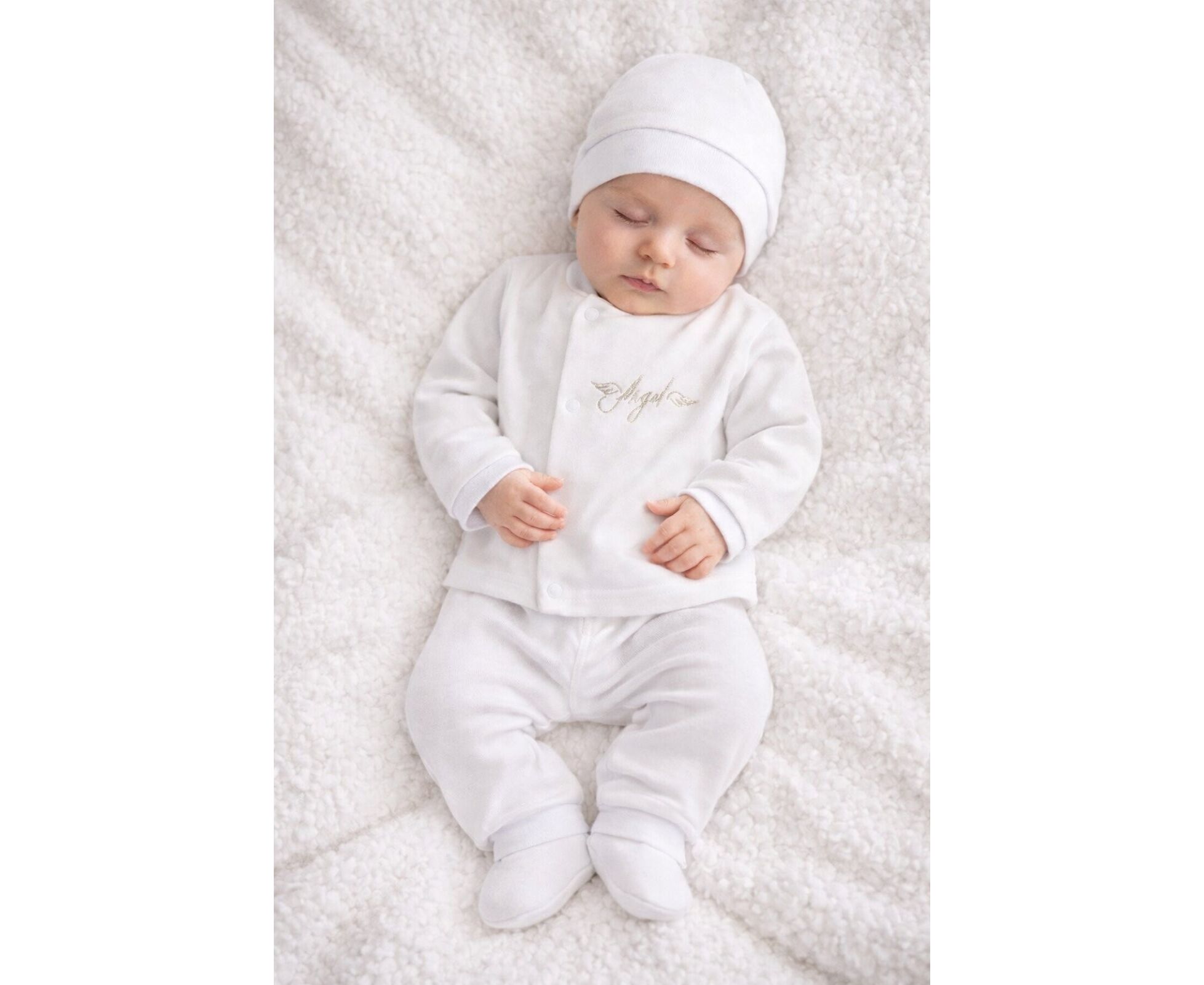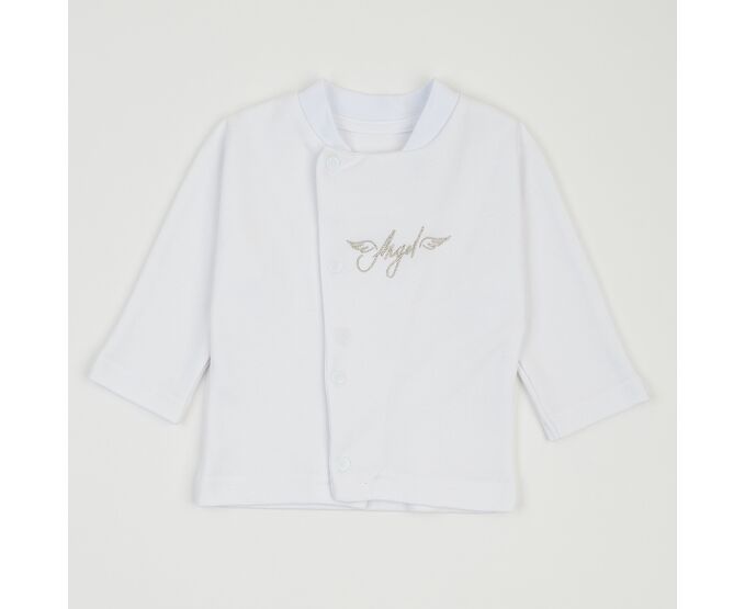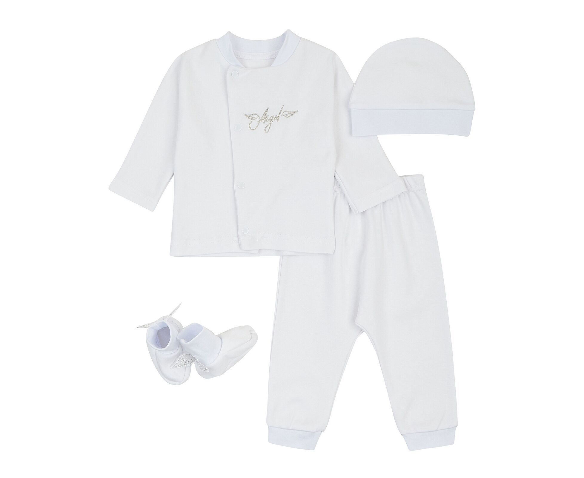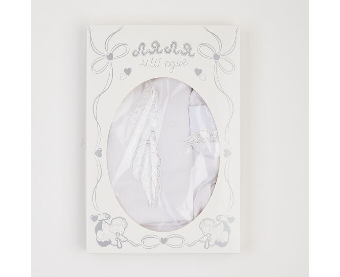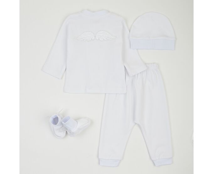 Хрестильний набір для хлопчика складається з кофточки, штанців, шапки та пінеток. Підійде для святкових подій, таких як виписка із пологового, хрестини або будь-яке інше свято. Кофточка з асиметричною застібкою на кнопки, прикрашена по переду та по спинці тематичною вишивкою. з якою поєднується декоративна відлітна вишивка-крильця на пінетках. На шапочці та по низу штанів широка м'яка манжета з еластичної тканини. По поясу штанів еластична тасьма.