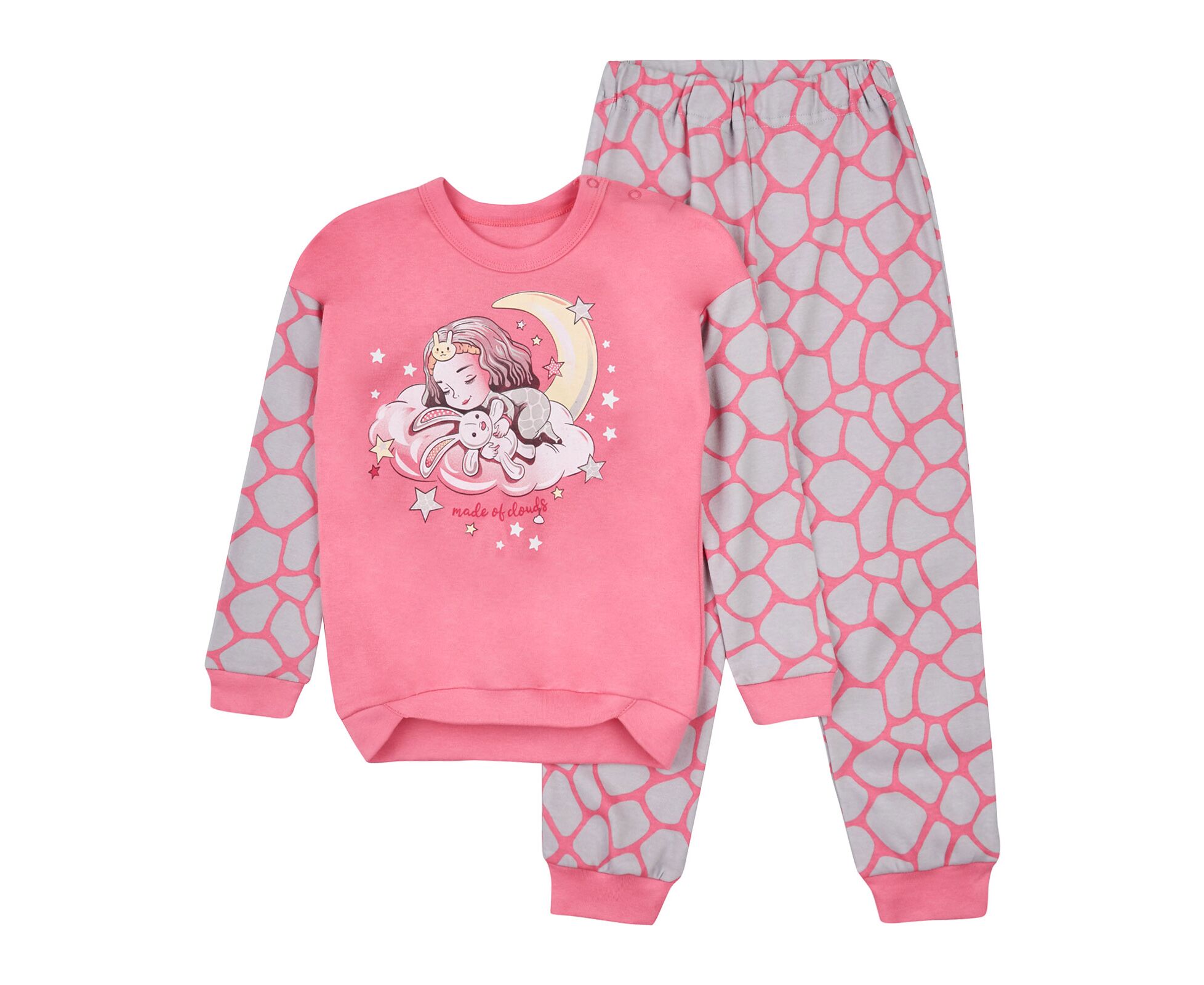 Комплект домашнього одягу (піжама) для дівчинки, з бавовняного інтерлока цікаво поєднаних кольорів, оздоблений друком на переді реглану. Реглан з застібкою на плечі на кнопки, з зпущеним плечем, з еластичною планкою по круглому вирізу горловини, з фігурним притачним поясом по низу з еластичного полотна. Штани з цільнокроєним поясом на резинці, довжину резинки можна регулювати. По низу штанів та низу рукавів - манжети з еластичної рібани.