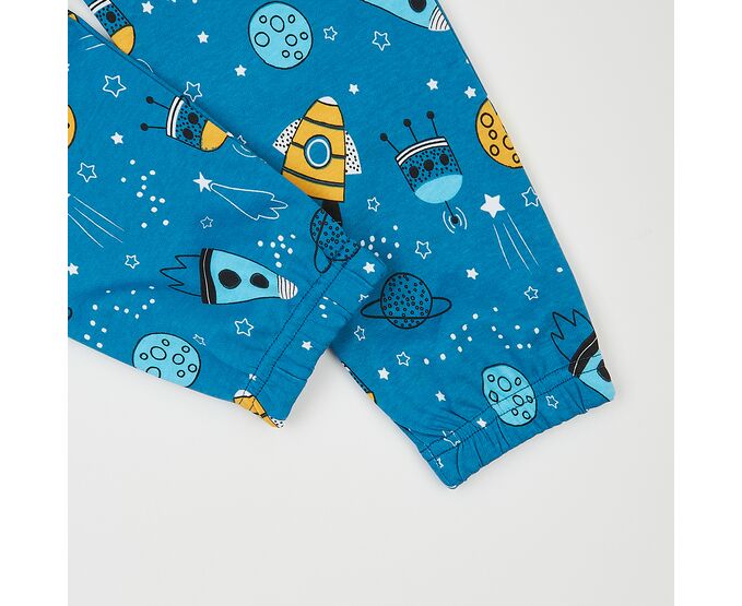 Дитячий комплект домашнього одягу з м'якого, дуже приємного на дотик, інтерлока, що добре тримає форму навіть після багаторазового прання. Реглан вільного силуету, з спущеним плечем, з круглим вирізом горловини, з застібкою на кнопки по плечу. Штани з цільнокроєним поясом на резинці, довжину резинки можна регулювати. По низу рукавів та низу реглана - манжети з еластичної рібани, низки штанів на еластичній тасьмі.