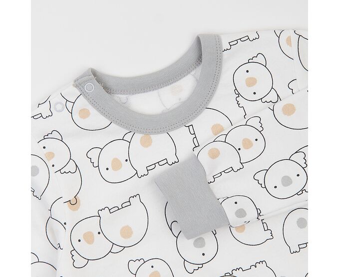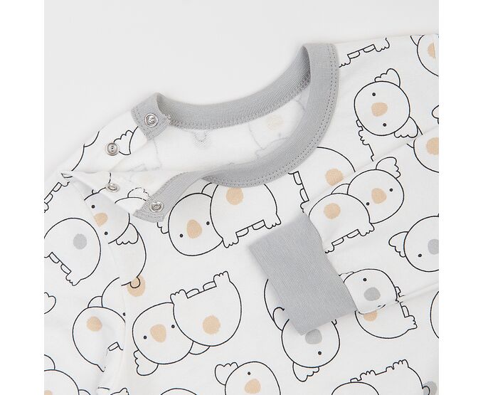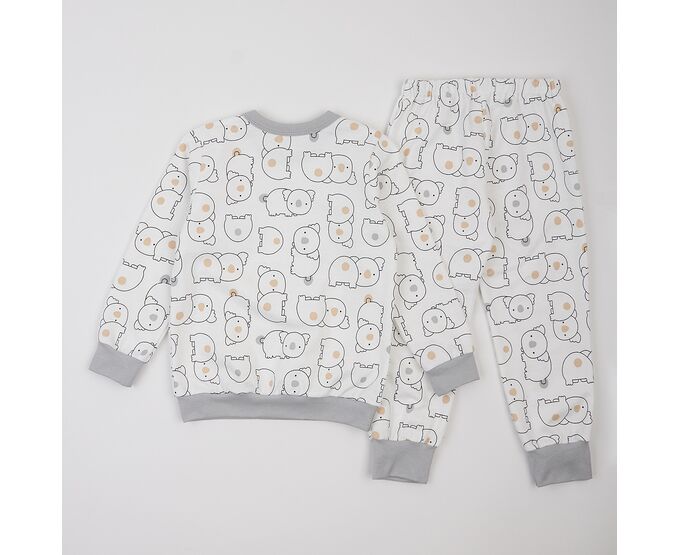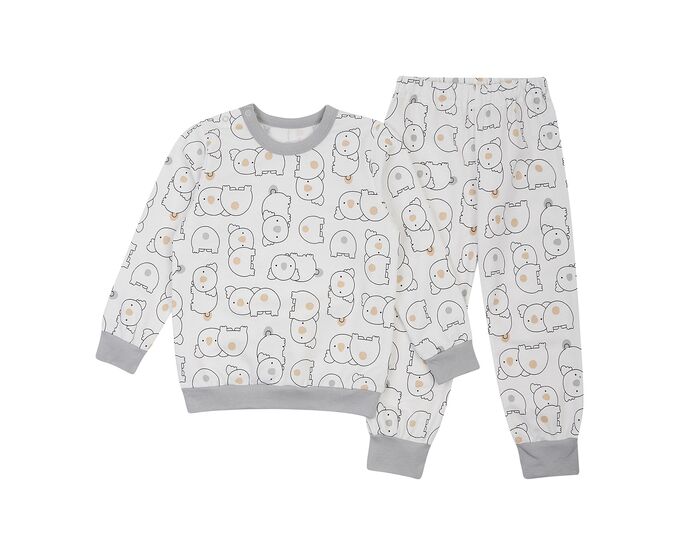 Теплий дитячий комплект домашнього одягу з м'якого, дуже приємного на дотик футеру з начосом, що добре тримає форму навіть після багаторазового прання та не скачується. Реглан з круглим вирізом горловини, застібкою на плечі на кнопки. Штани з цільнокроєним поясом на резинці, довжину резинки можна регулювати. По низу штанів, низу рукавів та низу реглана - манжети з еластичної рібани.
