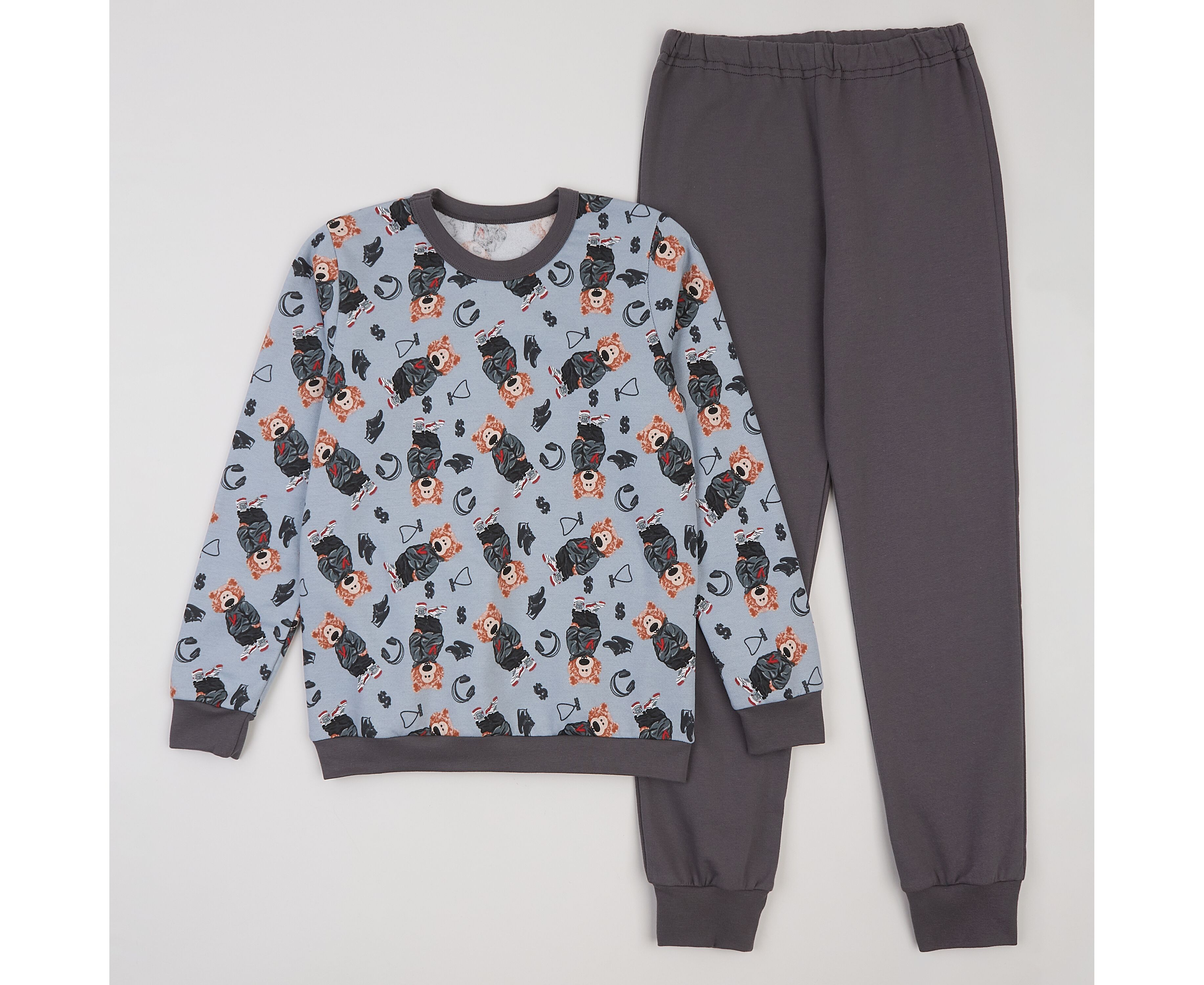Теплий дитячий комплект домашнього одягу (піжама), з м'якого, дуже приємного на дотик футеру з начосом, що добре тримає форму навіть після багаторазового прання та не скачується. Реглан з еластичною планкою по круглому вирізу горловини, по низу з притачним поясом з еластичного полотна, без застібки. Штани з цільнокроєним поясом на резинці, довжину резинки можна регулювати. По низу штанів, та по низу рукавів реглана - манжети з еластичної рібани.