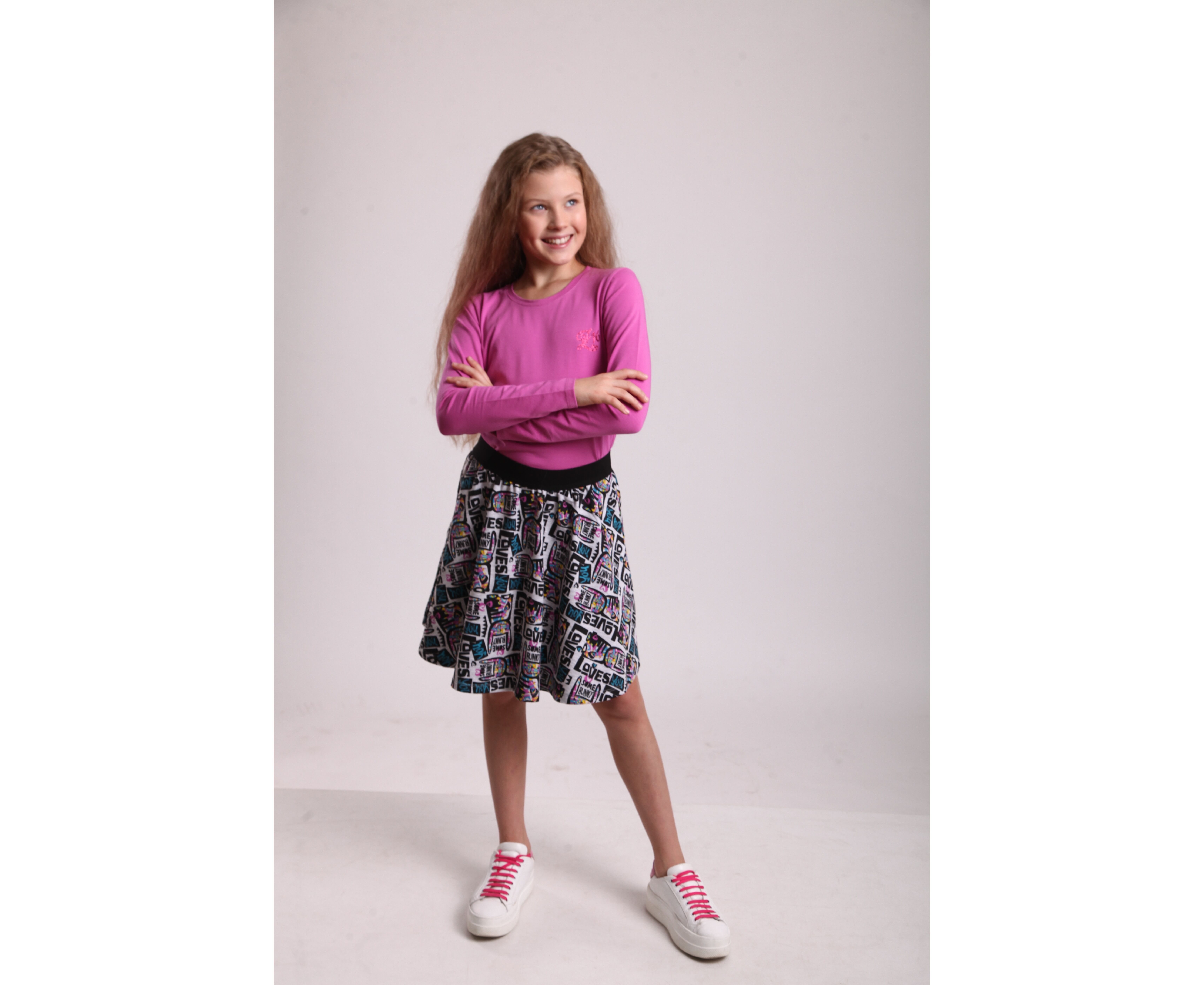 Спідниця - напівсонце, з бавовняного стрейч-футера двонитки з приємним, м'яким начосом, що добре тримає форму навіть після багаторазового прання та не скачується. Пояс з чорної широкої еластичної тасьми.