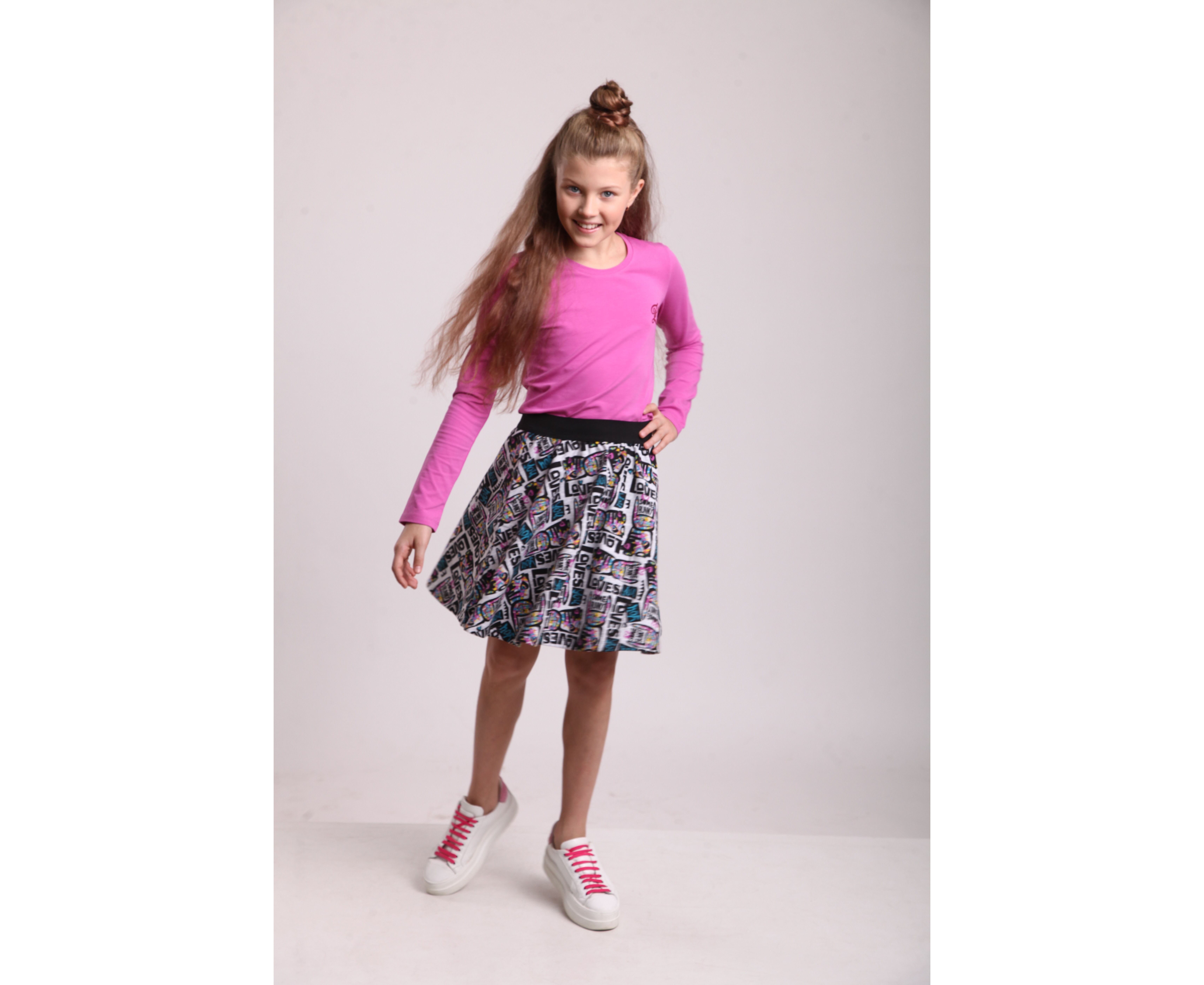 Спідниця - напівсонце, з бавовняного стрейч-футера двонитки з приємним, м'яким начосом, що добре тримає форму навіть після багаторазового прання та не скачується. Пояс з чорної широкої еластичної тасьми.