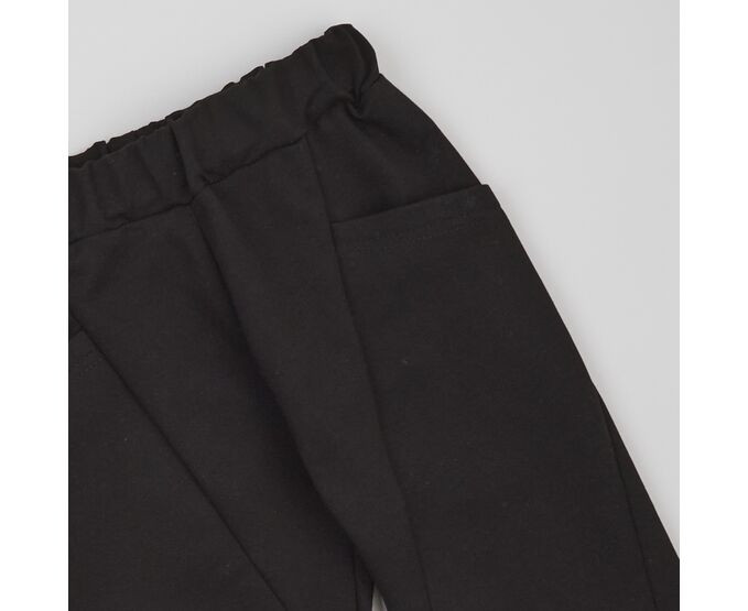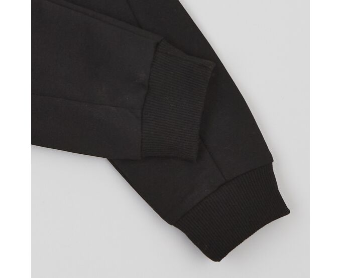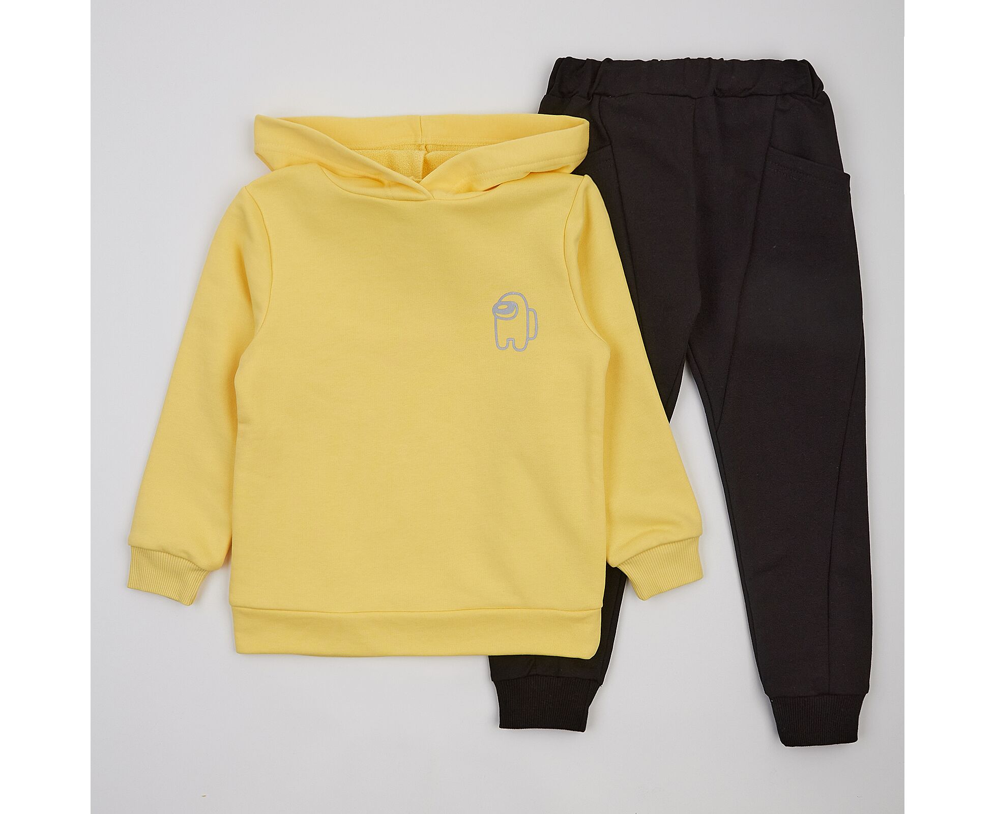 Дитячий спортивний костюм з худі та штанів. Худі з каптуром, вільного силуету, з якісної, приємної на дотик тринитки-петлі, яка не скачується та добре тримає форму навіть після багаторазового прання. Перед оздоблений стильною клейовою світловідбивною наліпкою. Рукав втачний, по низу рукавів манжети з фактурного еластичного полотна. Штани з якісної чорної двонитки-петлі, яка добре тримає форму навіть після багаторазового прання та не зкачується. Зпереду в оригінальних скошених підрізах вмісткі глибокі кишені. Притачний пояс з еластичною тасьмою.По низу штанів манжети з еластичного рубчику.