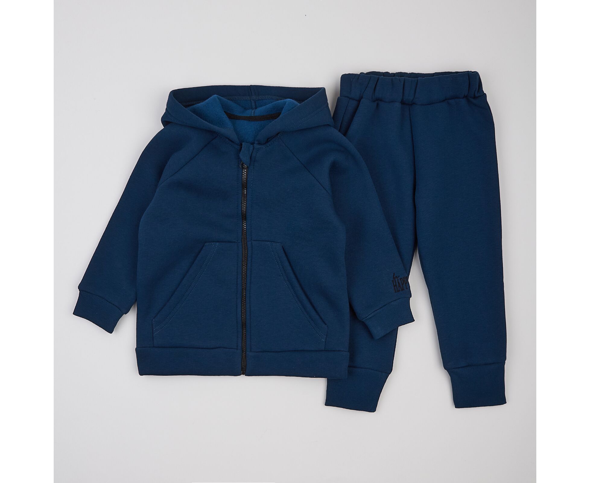 Стильний костюм з теплої, з приємним на дотик начосом всередині, трьохнитки преміум якості. Кофта з каптуром, з кишенею-кенгурушкою На рукаві невеличка вишивка. Центральна застібка на блискавку-трактор, шви горловини та блискавки зсередини закриті бавовняною оздоблювальною тасьмою. По низу рукавів кофти та по низкам штанів - манжети з еластичного фактурного полотна. В пояс продіта еластична гумка.