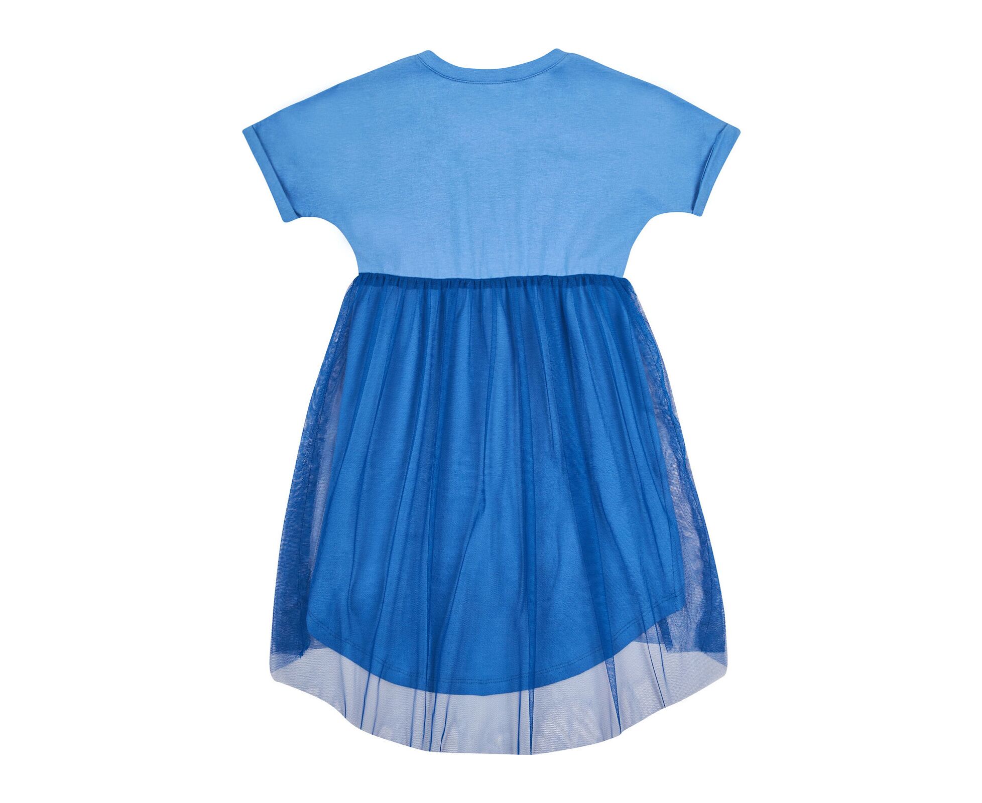 Сукня з рожевого стрейч-куліру (97%бавовна 3%еластан) з додатковою пришивною спідницею з єврофатину контрасного кольору. Ліф сукні з цільнокроєним рукавом, з відворотами по низу рукава, з пришивною планкою по круглому вирізу горловини. На переді ліфа стильний друк.