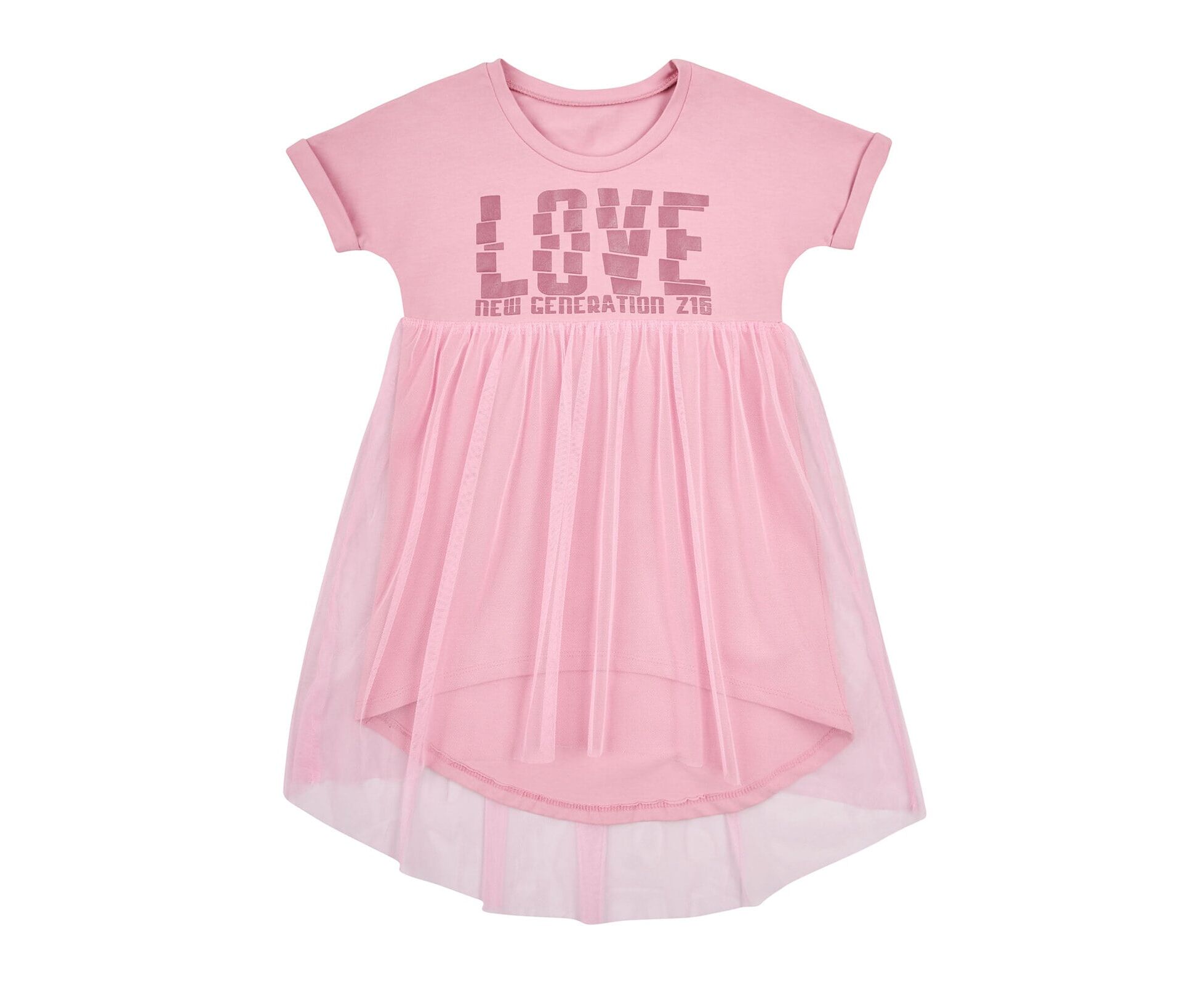 Сукня з рожевого стрейч-куліру (97%бавовна 3%еластан) з додатковою пришивною спідницею з єврофатину контрасного кольору. Ліф сукні з цільнокроєним рукавом, з відворотами по низу рукава, з пришивною планкою по круглому вирізу горловини. На переді ліфа стильний друк.
