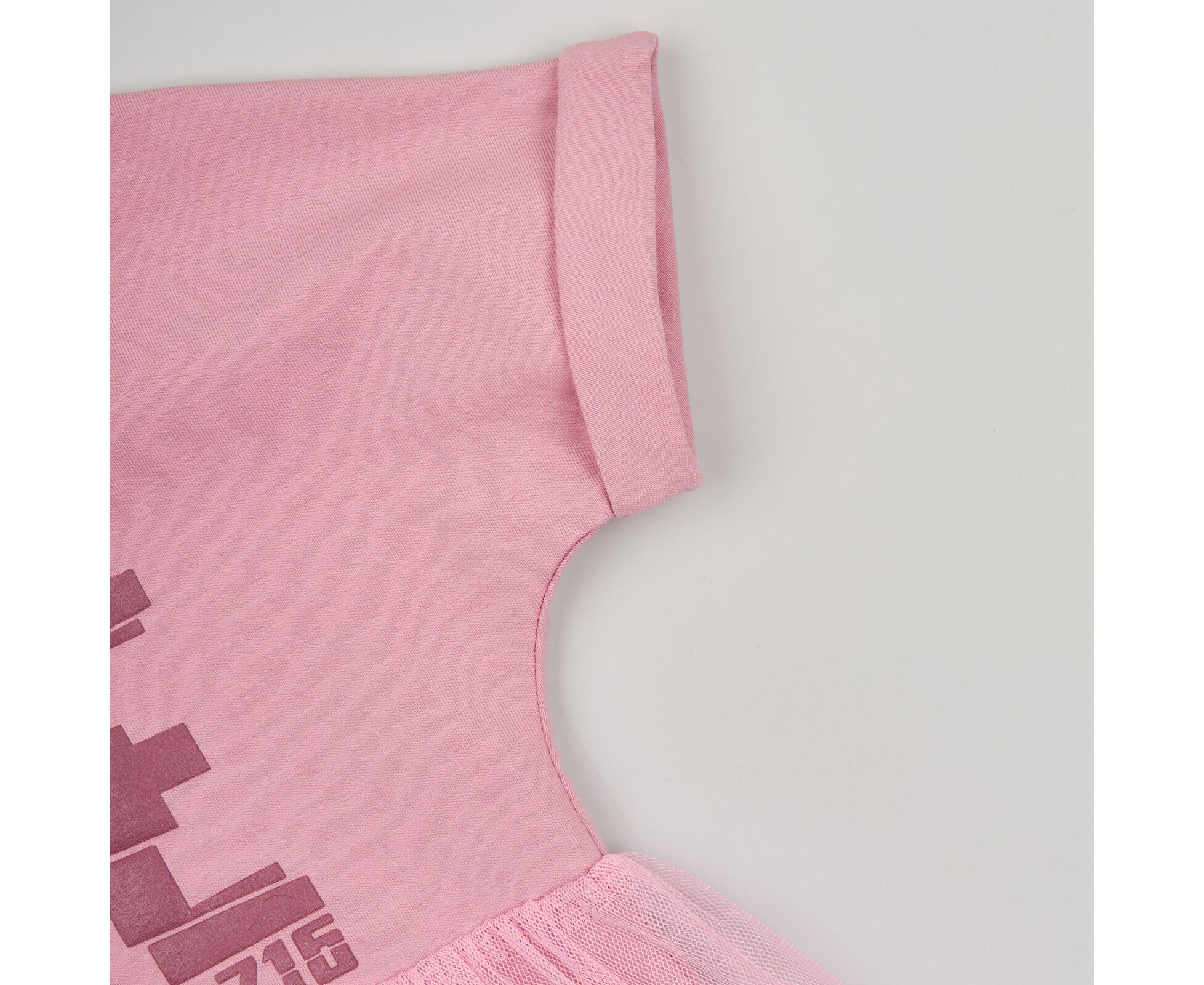 Сукня з рожевого стрейч-куліру (97%бавовна 3%еластан) з додатковою пришивною спідницею з єврофатину контрасного кольору. Ліф сукні з цільнокроєним рукавом, з відворотами по низу рукава, з пришивною планкою по круглому вирізу горловини. На переді ліфа стильний друк.