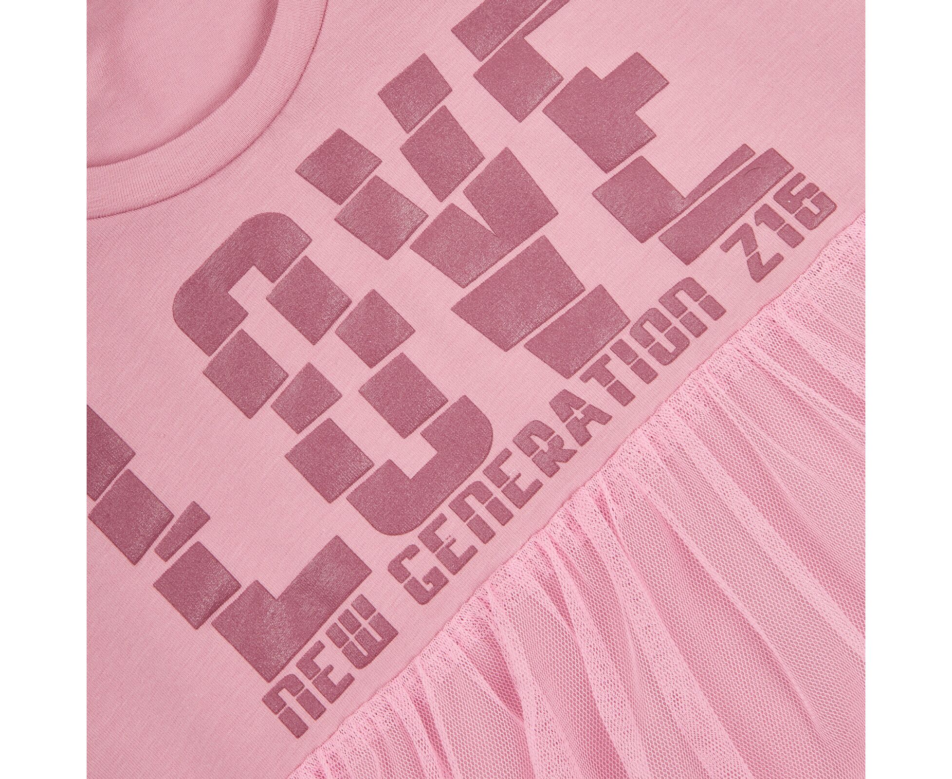 Сукня з рожевого стрейч-куліру (97%бавовна 3%еластан) з додатковою пришивною спідницею з єврофатину контрасного кольору. Ліф сукні з цільнокроєним рукавом, з відворотами по низу рукава, з пришивною планкою по круглому вирізу горловини. На переді ліфа стильний друк.