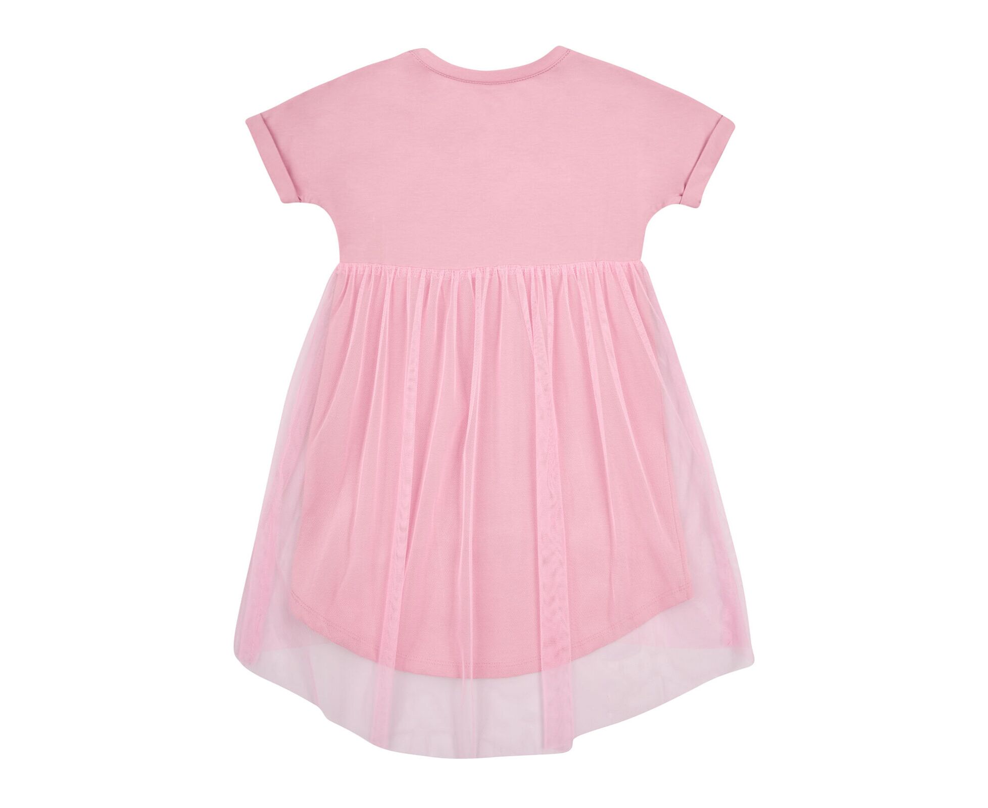 Сукня з рожевого стрейч-куліру (97%бавовна 3%еластан) з додатковою пришивною спідницею з єврофатину контрасного кольору. Ліф сукні з цільнокроєним рукавом, з відворотами по низу рукава, з пришивною планкою по круглому вирізу горловини. На переді ліфа стильний друк.