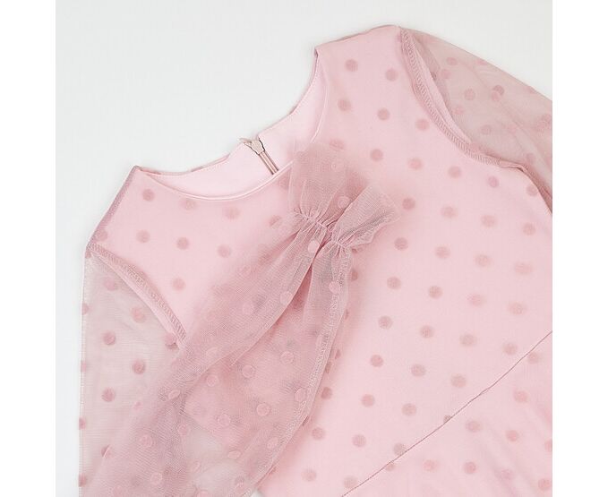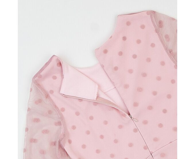 Вишукана двошарова сукня для стильної дівчинки. Верхній шар виготовлений з м'якої еластичної євросітки з флоком. Сукня на підкладці з бавовняного інтерлока, що забезпечує комфорт та виключає будь-яке подразнення. .Спинка сукні із застібкою на таємну блискавку в середньому шві. Рукав втачний прозорий, з призборкою по низу на еластичну нитку. Призборені волани надають образу легкості та романтичності.