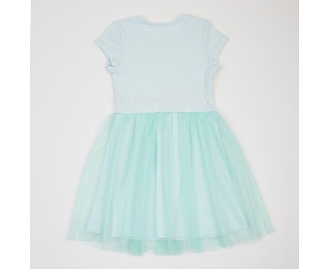 Стильна ментолова сукня з ошатним низом. Виготовлена з бавовняного інтерлока, присборена по талії спідничка з м'якої євросітки. Ліф сукні з бавовняної тканини з блискучим принтом. Сукня з втачним рукавом, застібкою по плечу на кнопки. По внутрішньому шву горловини оздоблювальний лампас з бавовняної рібани.