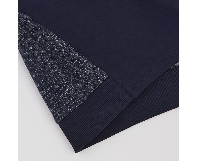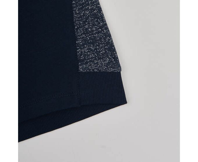 Стильний світшот з двонитки-петлі, яка добре тримає форму навіть після багаторазового прання. Поєднання меланжевої та однотонної тканини шляхом вставок та декоративних підрізів на переді та рукавах робить виріб дуже ориігнальним та стильним. Виріз горловини круглий, з еластичного рубчику. По внутрішньому шву горловини спинки оздоблювальний лампас. Манжети по рукавам та по низу виробу частково з еластичного рубчику.