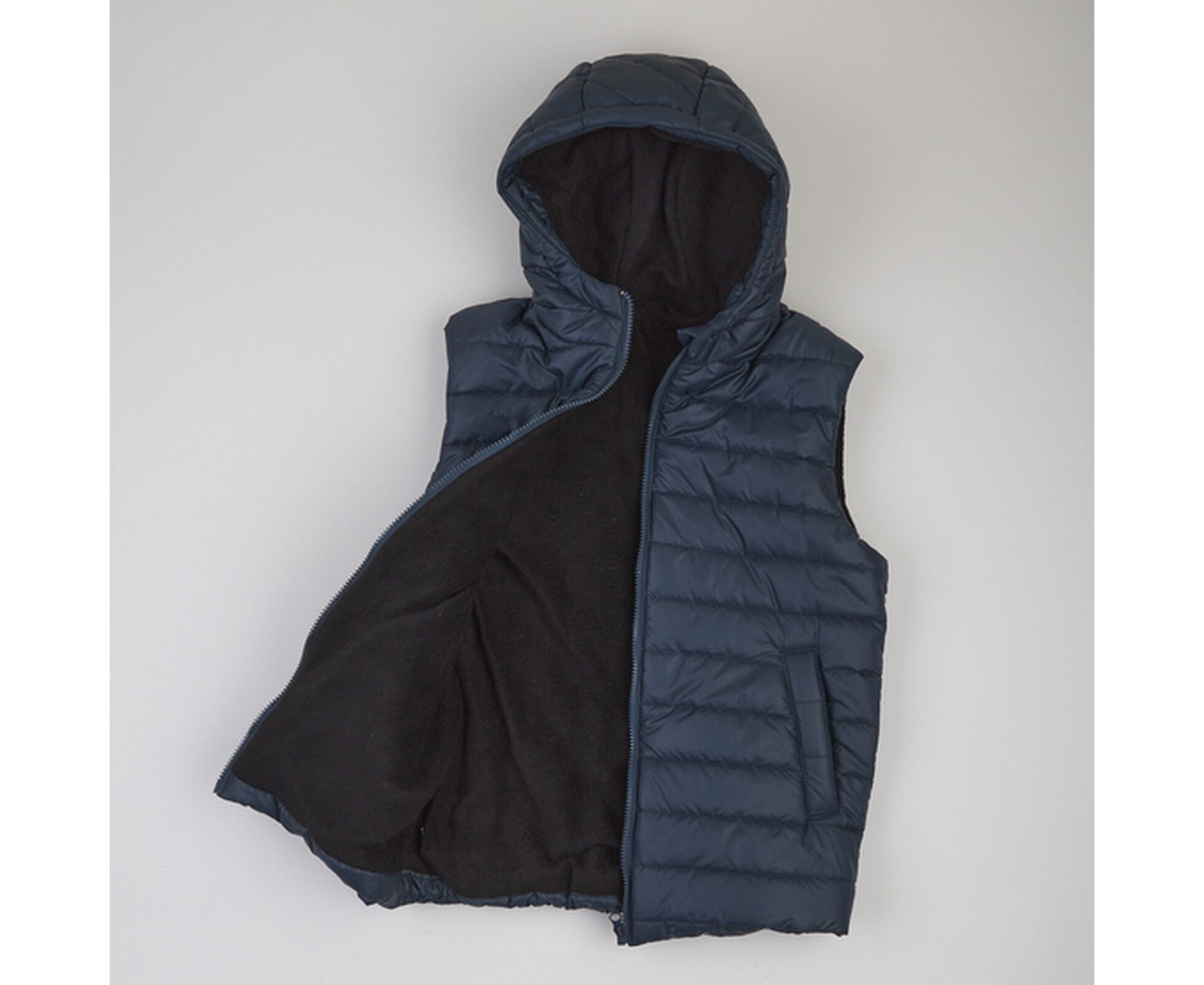 Зручний в прохолодну погоду жилет з каптуром та високою стійкою, з простьобаної плащовки лаке, на дуже приємному на дотик м'якенькому флісі ,з утеплювачем синтепух щільністю 150г/кв.м., який добре зберігає форму та об'єм, навіть після багаторазового стиснення. Застібка блискавка центральна , бокові кишені-"листочки" з підзором з флісу, що забезпечує рукам і тепло, і приємний дотик. Присборка на вузеньку резинку по низу спинки запобігає продуванню.