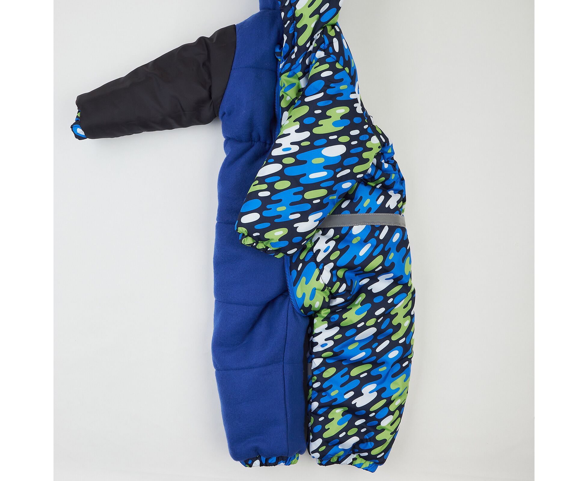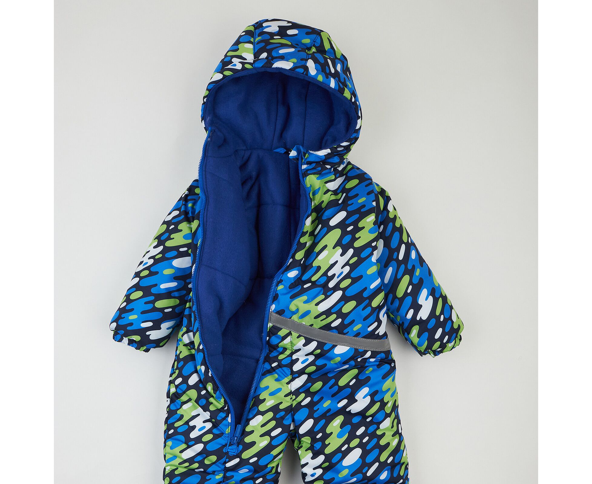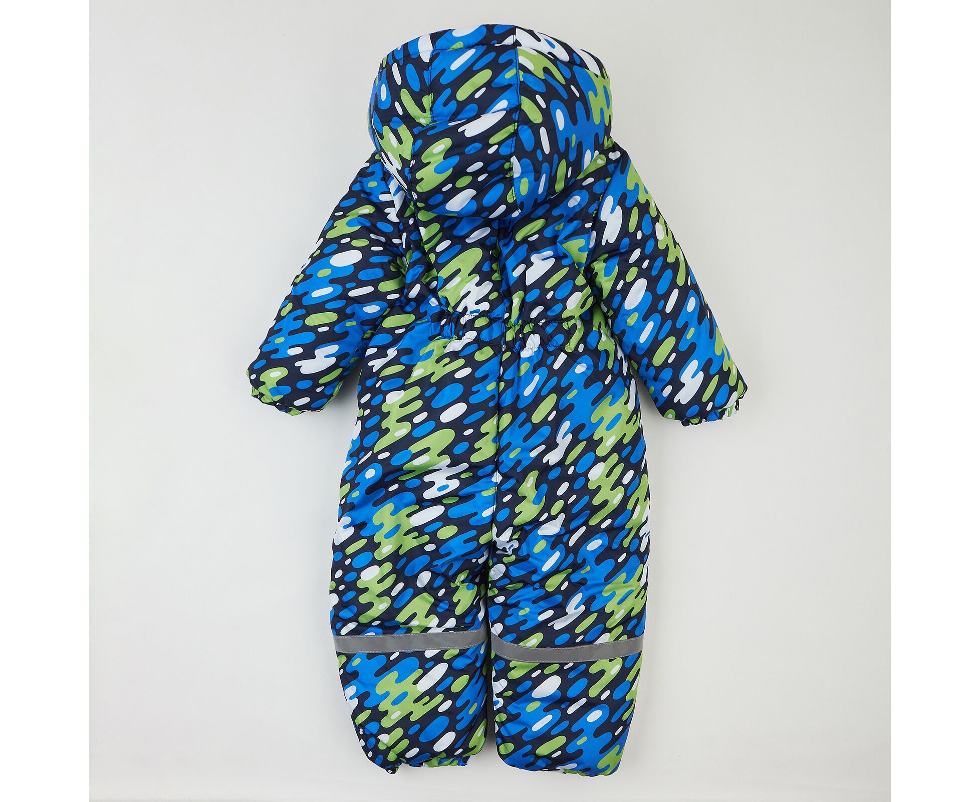 Комбінезон з каптуром із щільної воловідштовхувальної плащовки на флісі з утеплювачем синтепух щільністю 250г/кв.м. , який добре зберігає форму та об'єм, навіть після багаторазового стиснення та забезпечує тепло навіть при сильних морозах. Застібка асиметрична, низ ніжок та рукавів на еластичній тасьмі. Деталі переду та спинки оздоблені світловідбивними елементами. Для полегшення надягання на дитину виворіт рукавів з гладкої тканини підкладки.