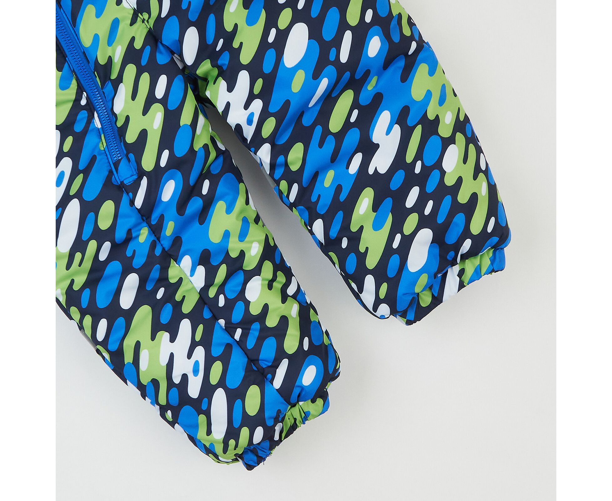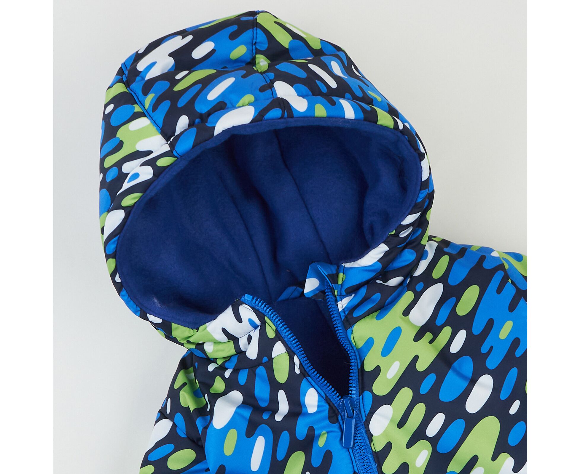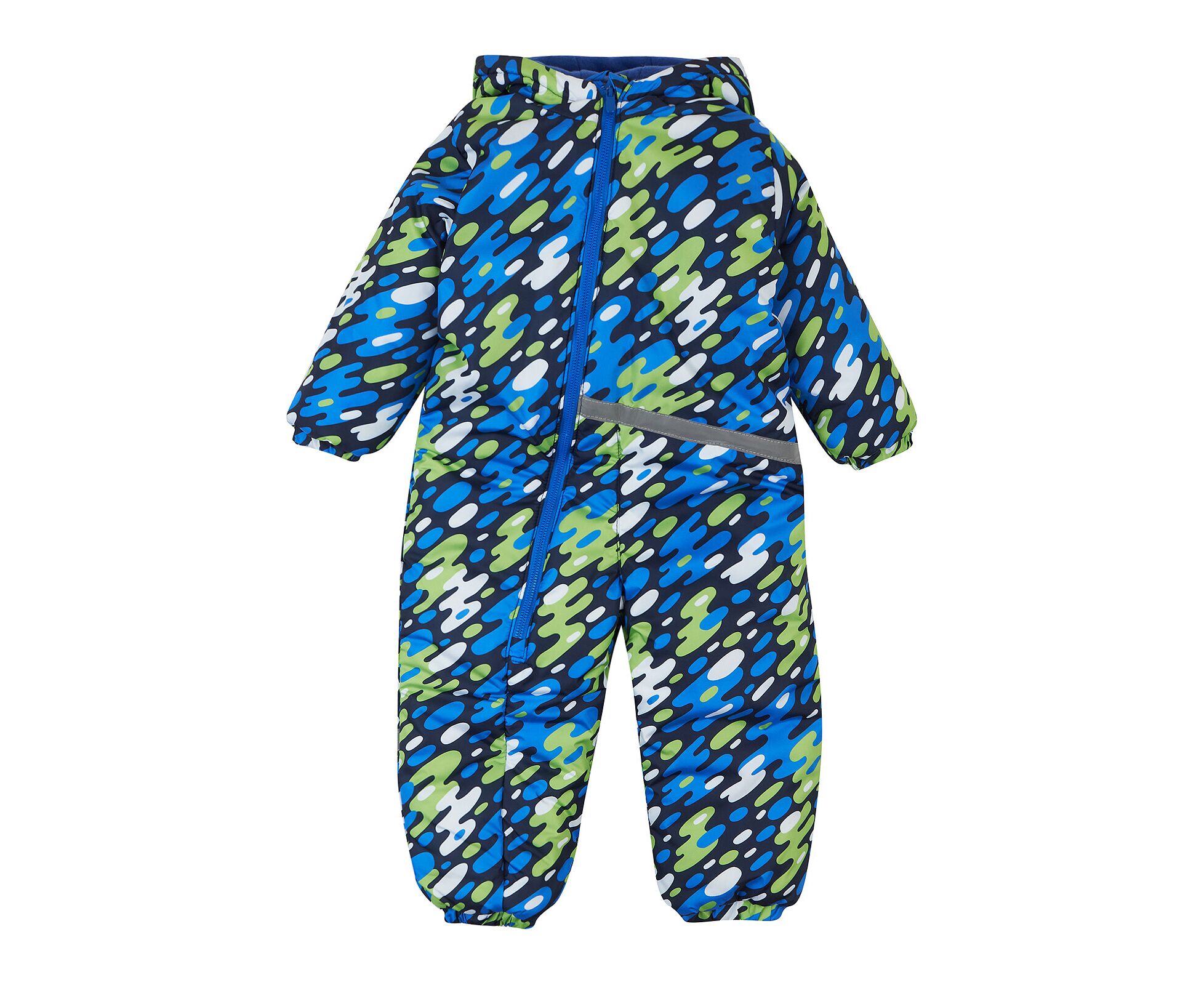 Комбінезон з каптуром із щільної воловідштовхувальної плащовки на флісі з утеплювачем синтепух щільністю 250г/кв.м. , який добре зберігає форму та об'єм, навіть після багаторазового стиснення та забезпечує тепло навіть при сильних морозах. Застібка асиметрична, низ ніжок та рукавів на еластичній тасьмі. Деталі переду та спинки оздоблені світловідбивними елементами. Для полегшення надягання на дитину виворіт рукавів з гладкої тканини підкладки.