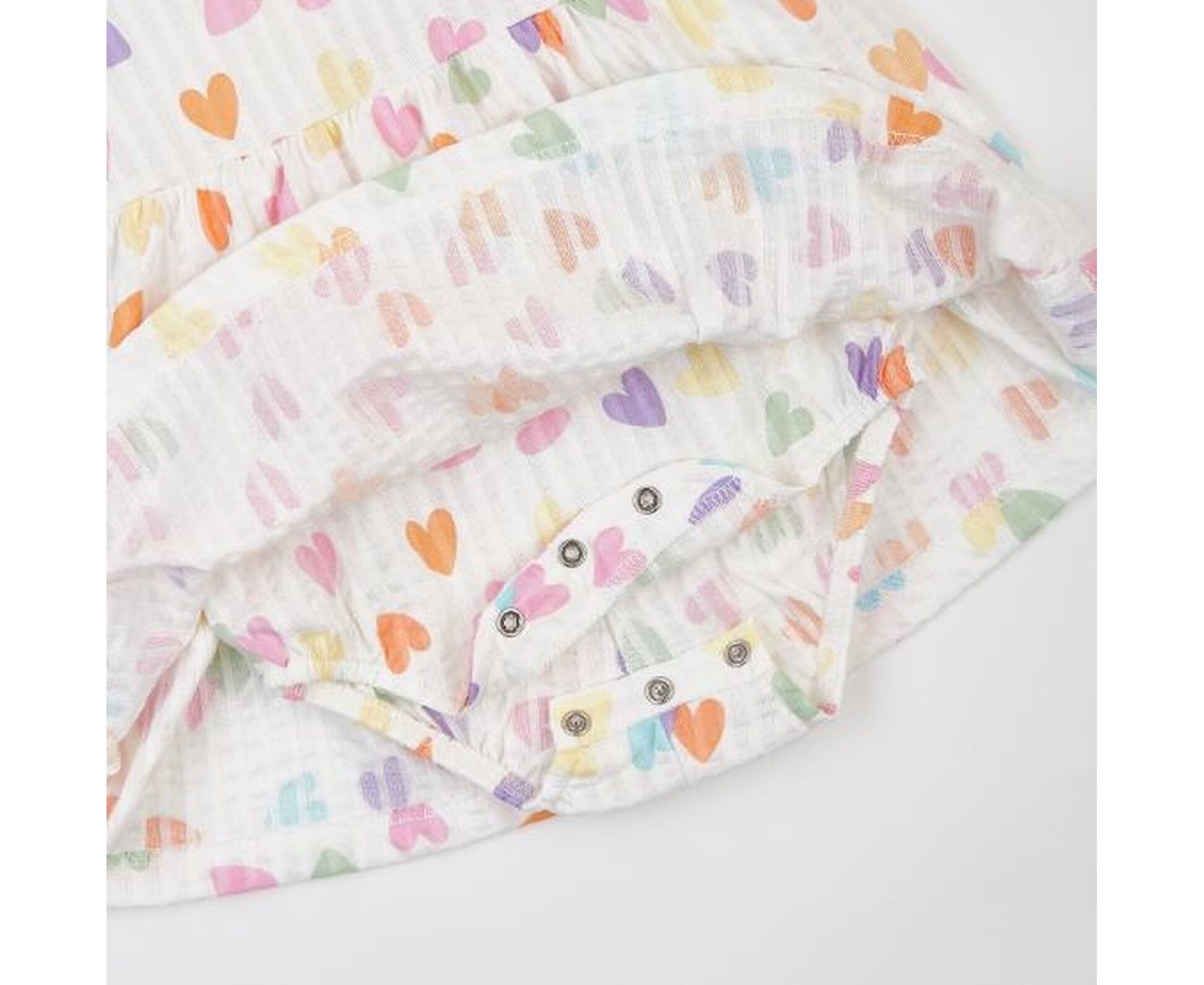 Літня дитяча боді-сукня. Виготовлена з тоненького, повністю бавовняного інтерлоку преміум-якості, переплетення якого забезпечує тканині невелику еластичність, а значить і зручність надягання виробу, Призборка по окату рукава та вшита по талії спідничка надають образу легкості та романтичності, Круглий виріз горловини оброблений бавовняною рібаною, на спинці застібка-крапелька Також застібка на кнопки на планочці між ніжкамих, що дозволяє при нагоді зручно та швидко замінити памперс. По ніжкам прокладена м'яка еластична гумка.