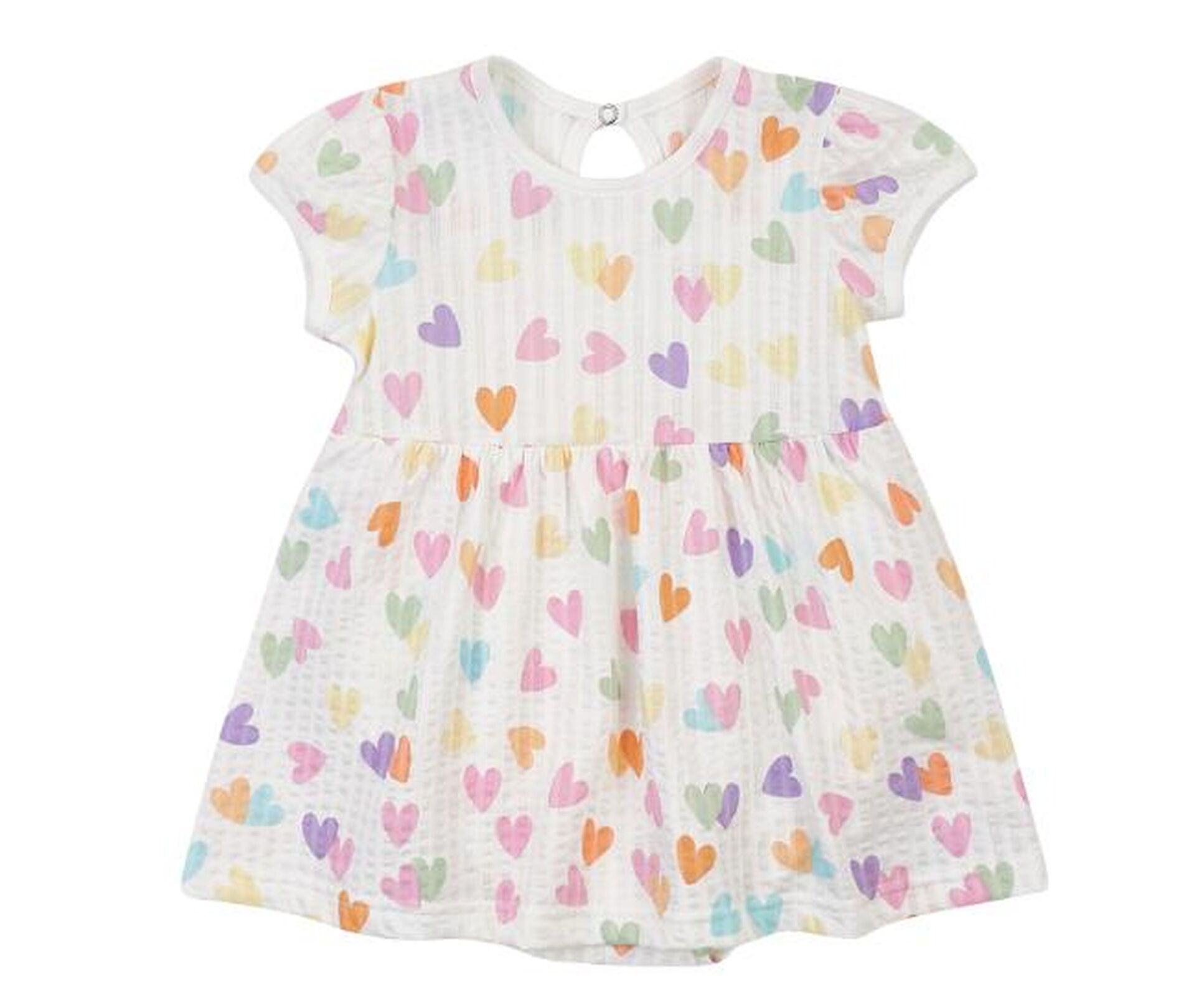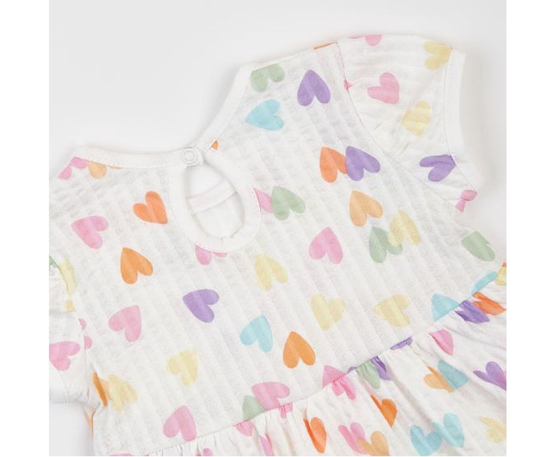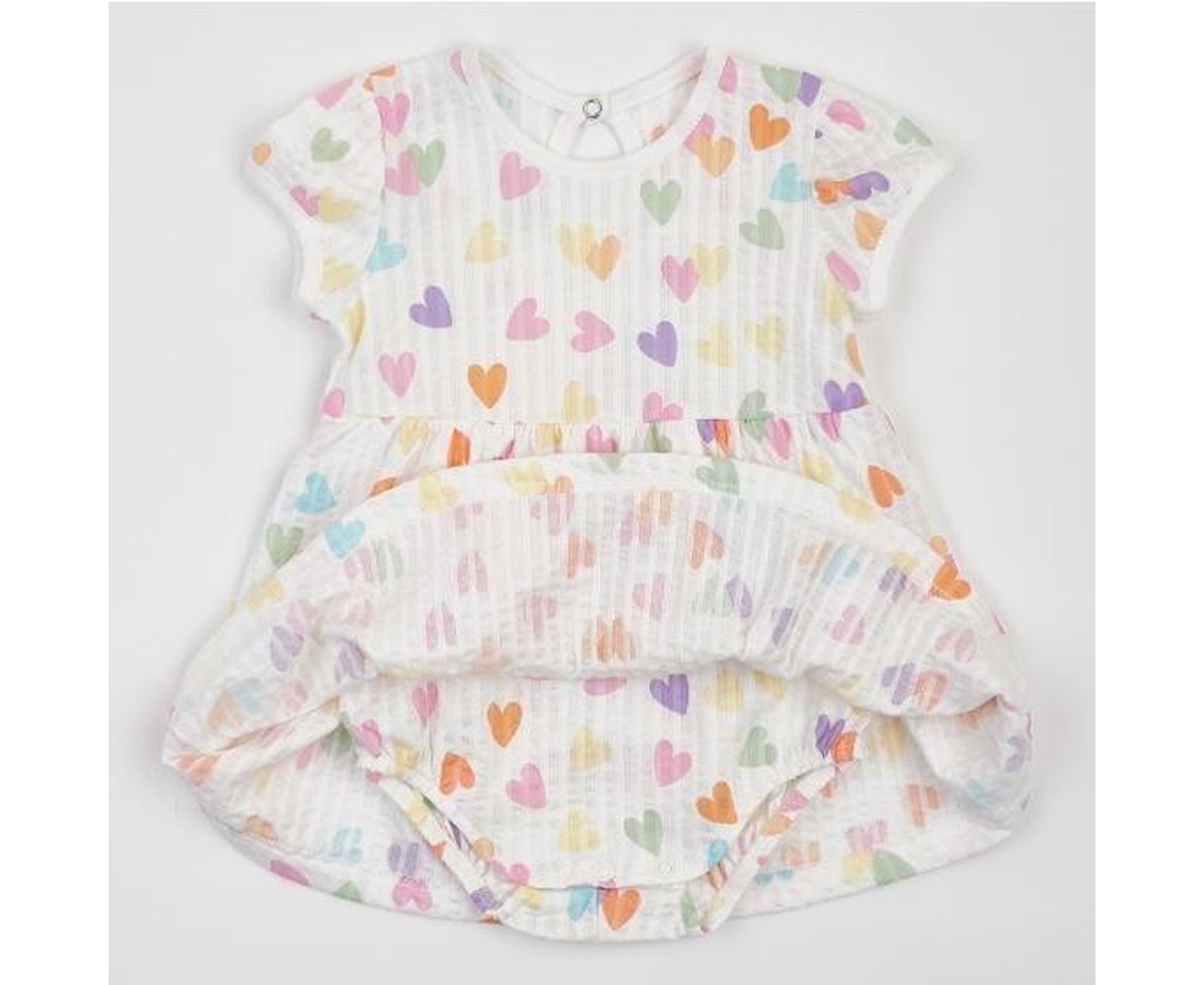 Літня дитяча боді-сукня. Виготовлена з тоненького, повністю бавовняного інтерлоку преміум-якості, переплетення якого забезпечує тканині невелику еластичність, а значить і зручність надягання виробу, Призборка по окату рукава та вшита по талії спідничка надають образу легкості та романтичності, Круглий виріз горловини оброблений бавовняною рібаною, на спинці застібка-крапелька Також застібка на кнопки на планочці між ніжкамих, що дозволяє при нагоді зручно та швидко замінити памперс. По ніжкам прокладена м'яка еластична гумка.