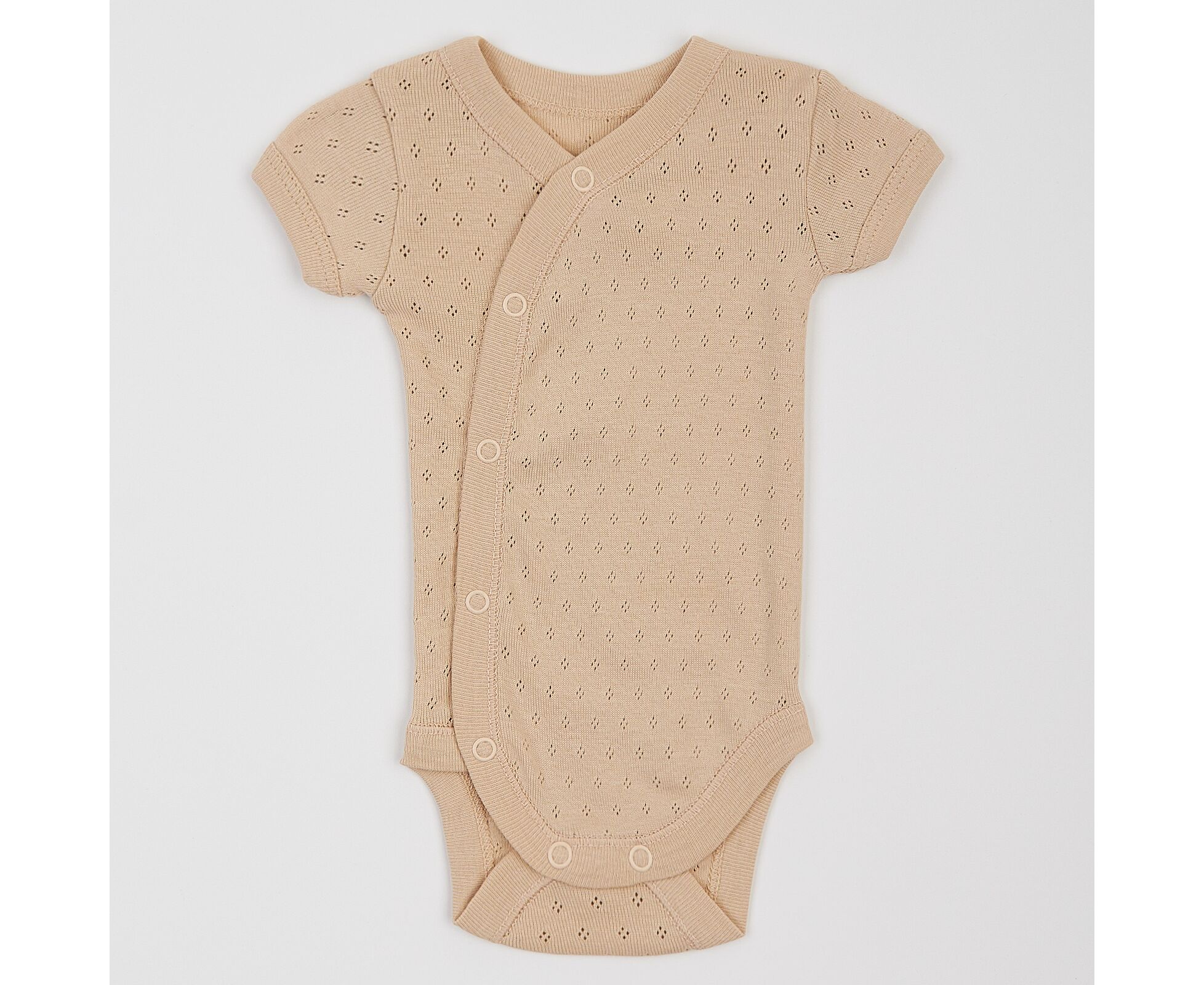 Легкий бодік з коротким рукавом, для новонароджених, з наздвичайно легкої, приємної на дотик, 100% бавовняної трикотажної тканини - ажур. Застбіка асиметрична по переду на кнопки та між ніжками. Всі зрізи та низ рукавів оброблені окантовкою з цієї ж тканини.