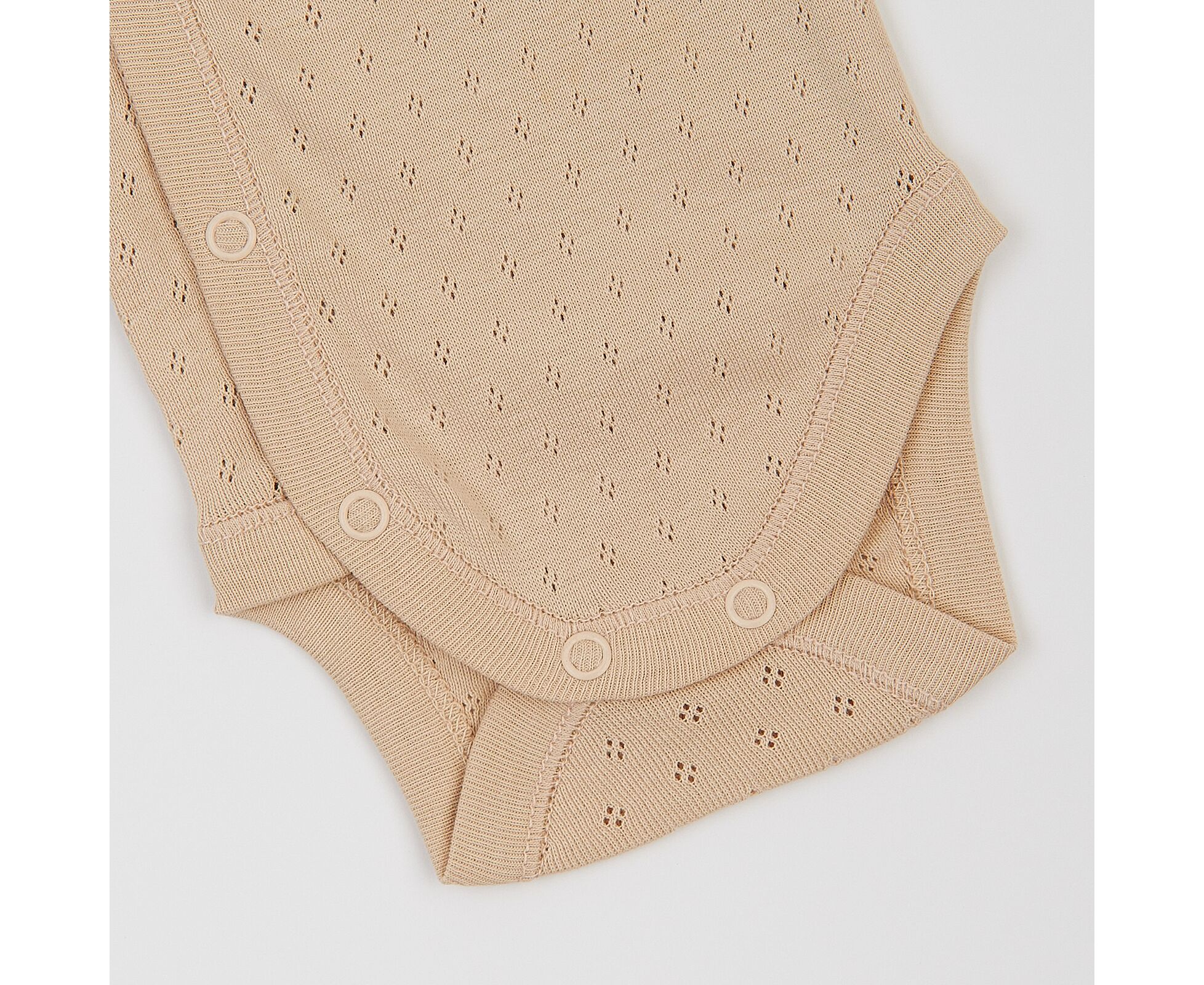 Легкий бодік з коротким рукавом, для новонароджених, з наздвичайно легкої, приємної на дотик, 100% бавовняної трикотажної тканини - ажур. Застбіка асиметрична по переду на кнопки та між ніжками. Всі зрізи та низ рукавів оброблені окантовкою з цієї ж тканини.