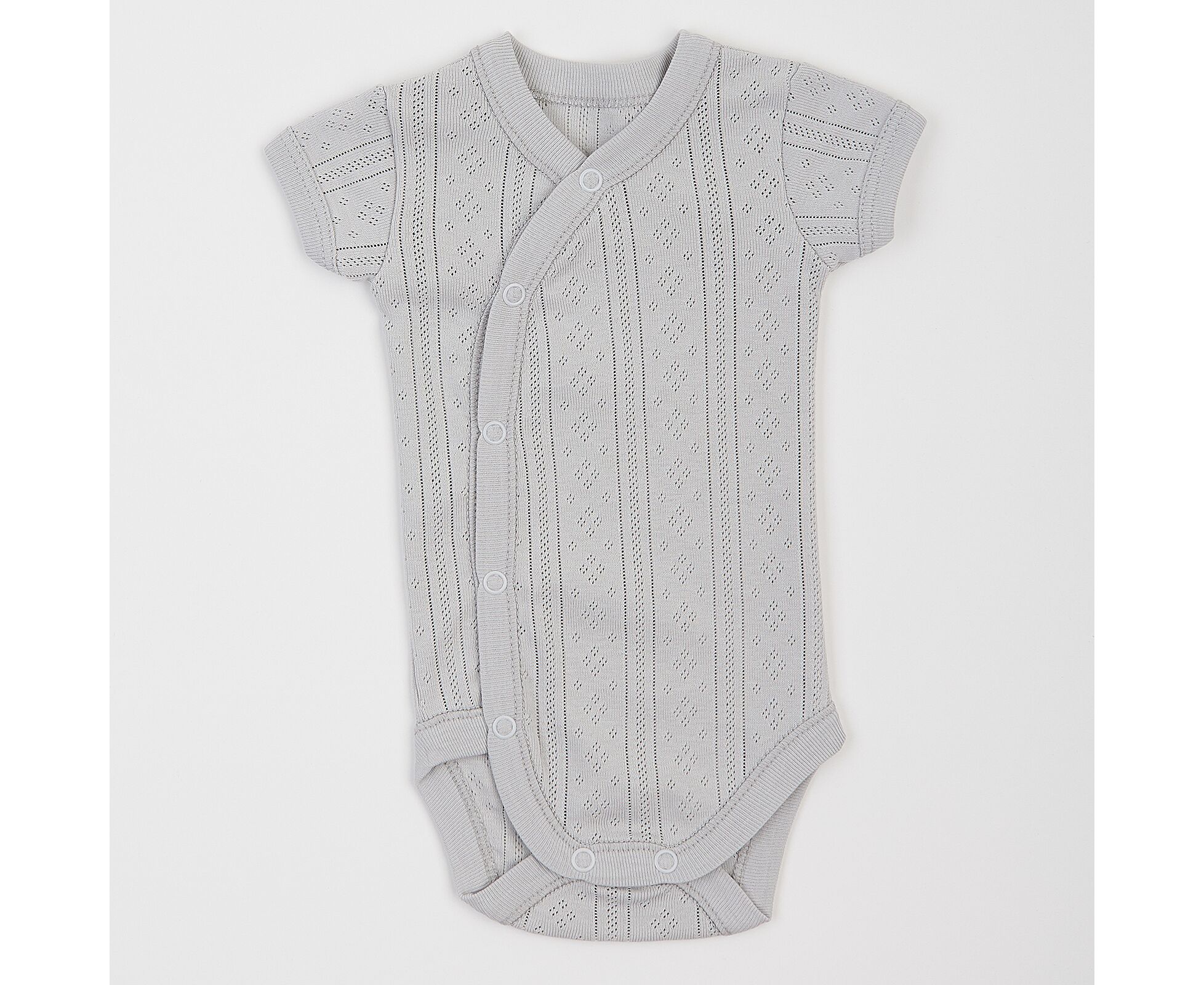 Легкий бодік з коротким рукавом, для новонароджених, з наздвичайно легкої, приємної на дотик, 100% бавовняної трикотажної тканини - ажур. Застбіка асиметрична по переду на кнопки та між ніжками. Всі зрізи та низ рукавів оброблені окантовкою з цієї ж тканини.