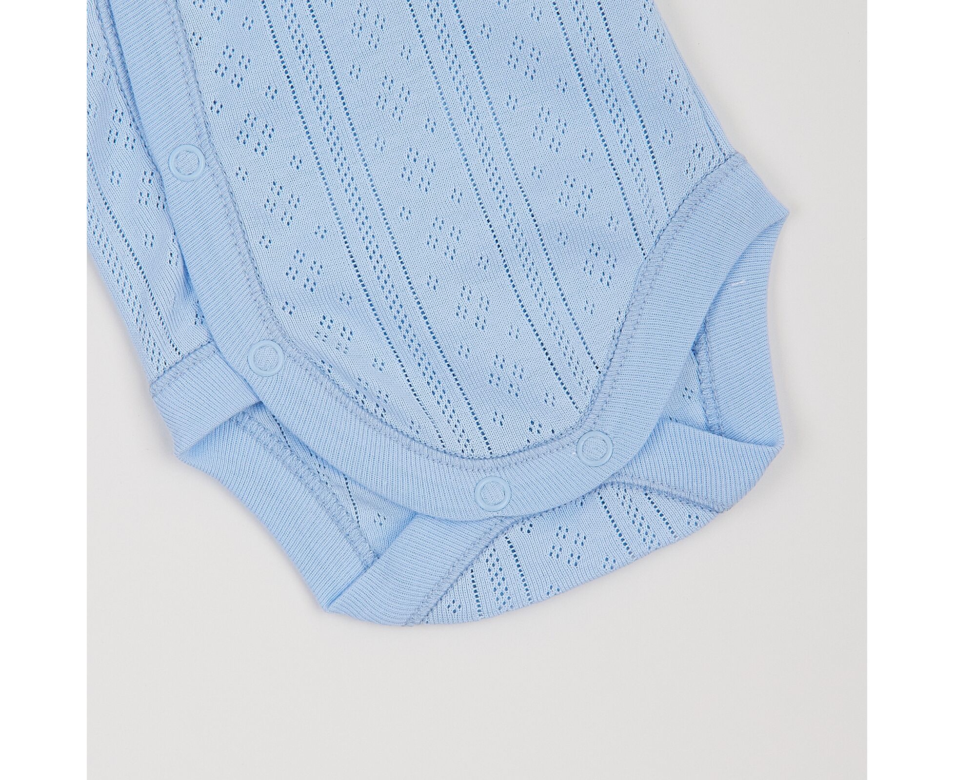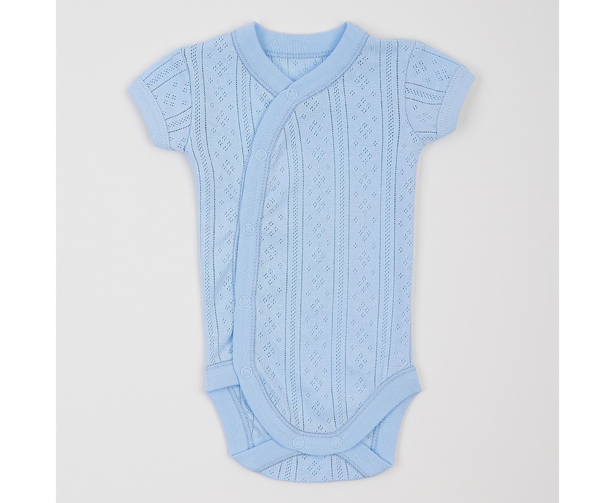 Легкий бодік з коротким рукавом, для новонароджених, з наздвичайно легкої, приємної на дотик, 100% бавовняної трикотажної тканини - ажур. Застбіка асиметрична по переду на кнопки та між ніжками. Всі зрізи та низ рукавів оброблені окантовкою з цієї ж тканини.