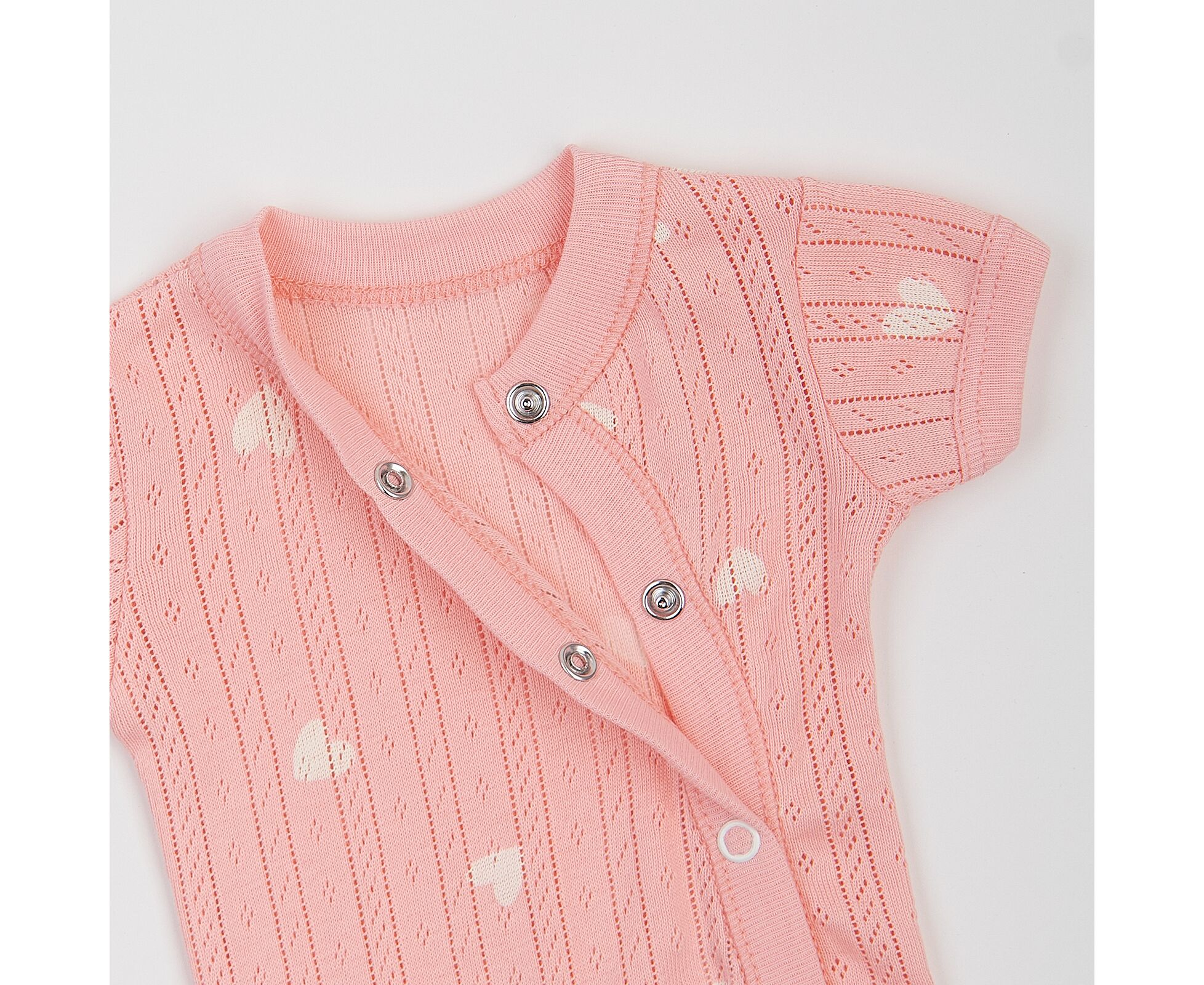 Легкий бодік з коротким рукавом, для новонароджених, з наздвичайно легкої, приємної на дотик, 100% бавовняної трикотажної тканини - ажур. Застбіка асиметрична по переду на кнопки та між ніжками. Всі зрізи та низ рукавів оброблені окантовкою з цієї ж тканини.