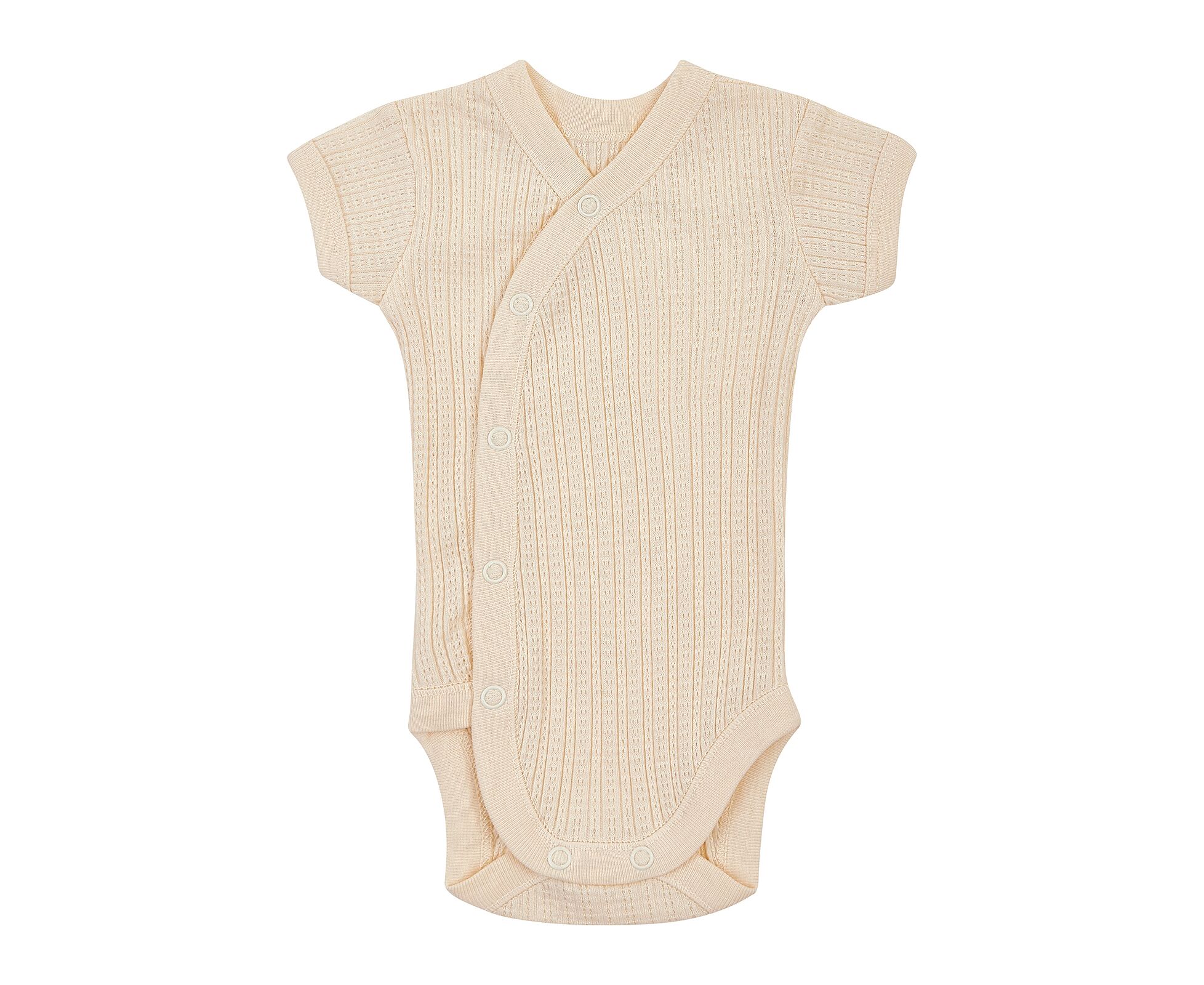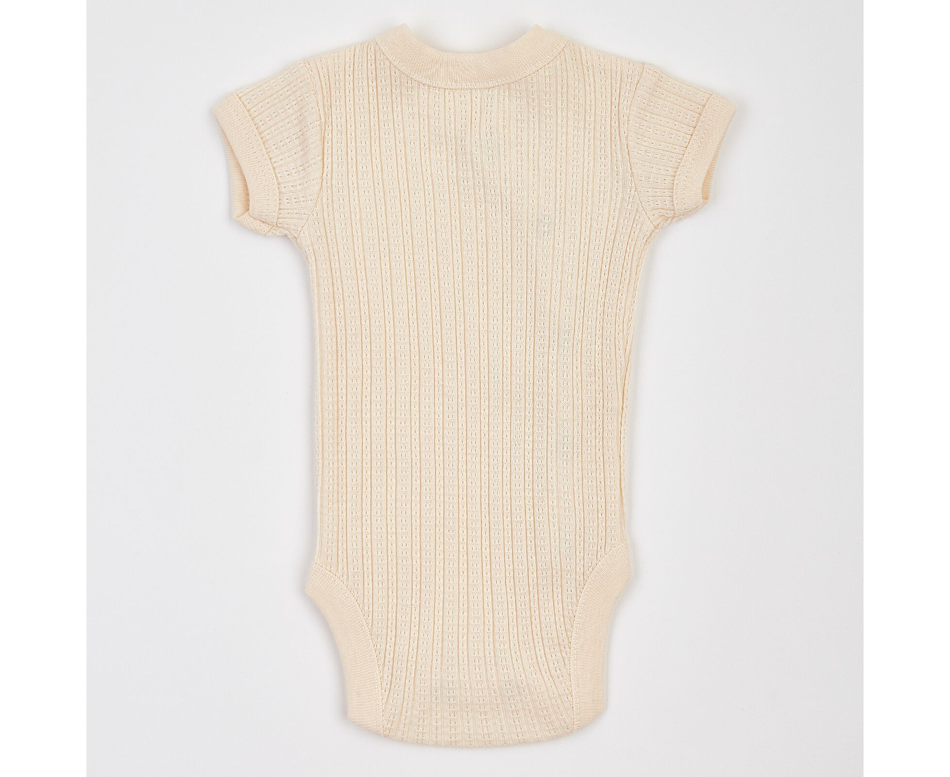 Легкий бодік з коротким рукавом, для малюків, з наздвичайно легкої, приємної на дотик, 100% бавовняної трикотажної тканини - ажур. Застбіка асиметрична по переду на кнопки та між ніжками. Всі зрізи та низ рукавів оброблені окантовкою з цієї ж тканини.
