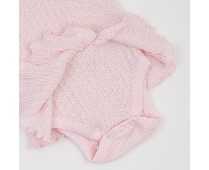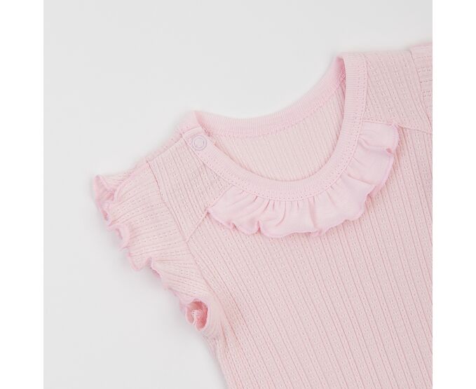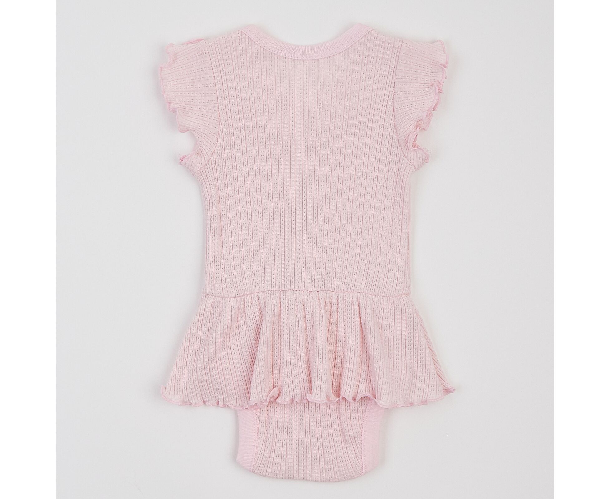 Літній бодік для дівчинки, з наздвичайно легкої, приємної на дотик, 100% бавовняної трикотажної тканини - фактурний ажур. Застбіка на кнопки по плечу та між ніжками. Рукав-крильце, рюш по горловині переду та волан по лінії талії, імітуючий спідничку, надають виробу романтичного стилю.