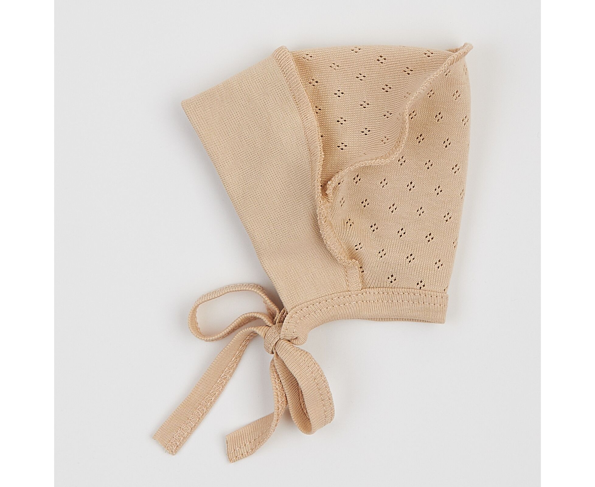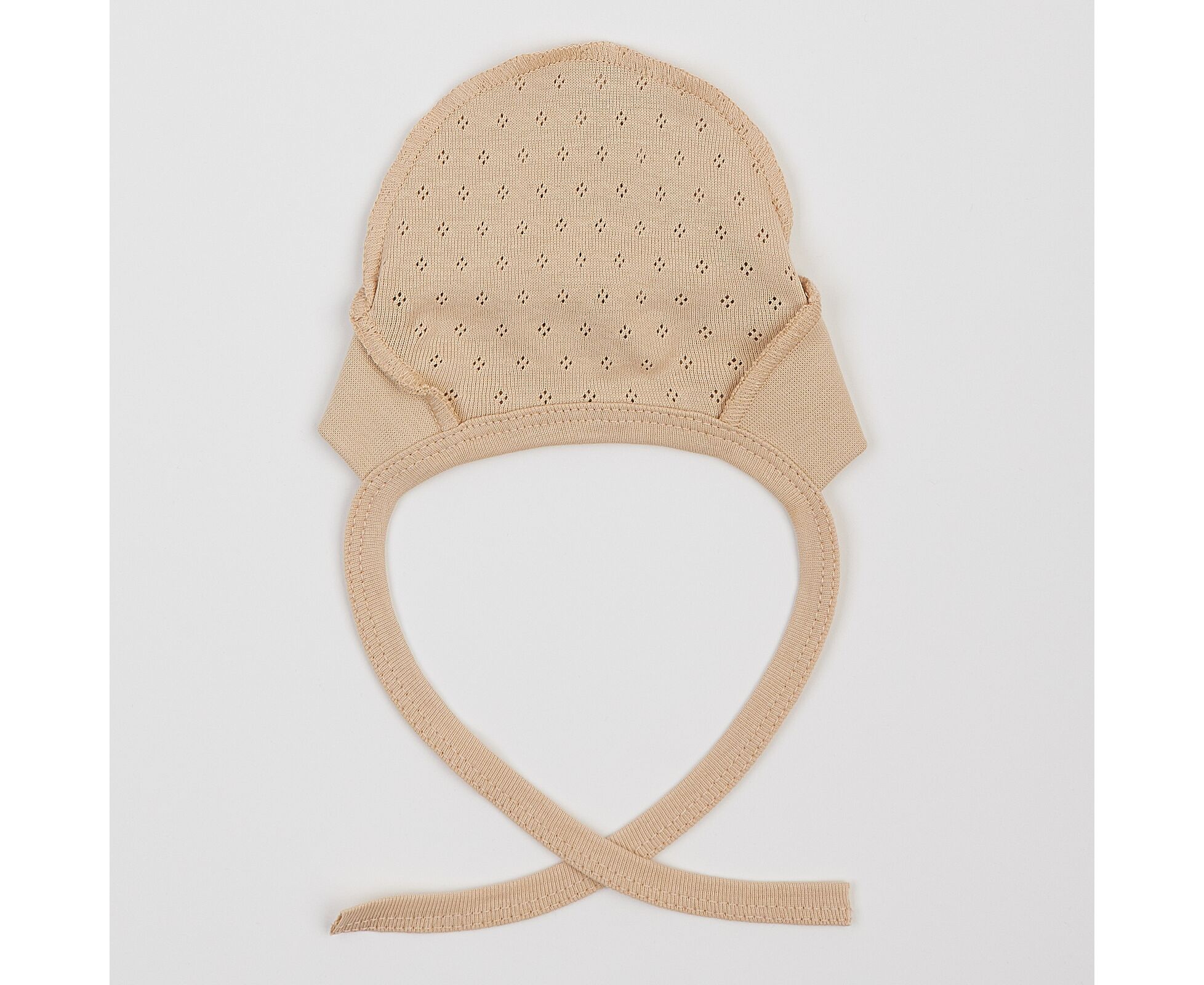 Чепчик для новонародженого, з наздвичайно м'якої, приємної на дотик 100% бавовняної трикотажної тканини - ажур. Передня деталь з еластичного полотна забезпечує ідеальну посадку та щільне прилягання. Шви виробу назовні і не торкаються шкіри дитини, виключаючи будь-який дискомфорт та подразнення.