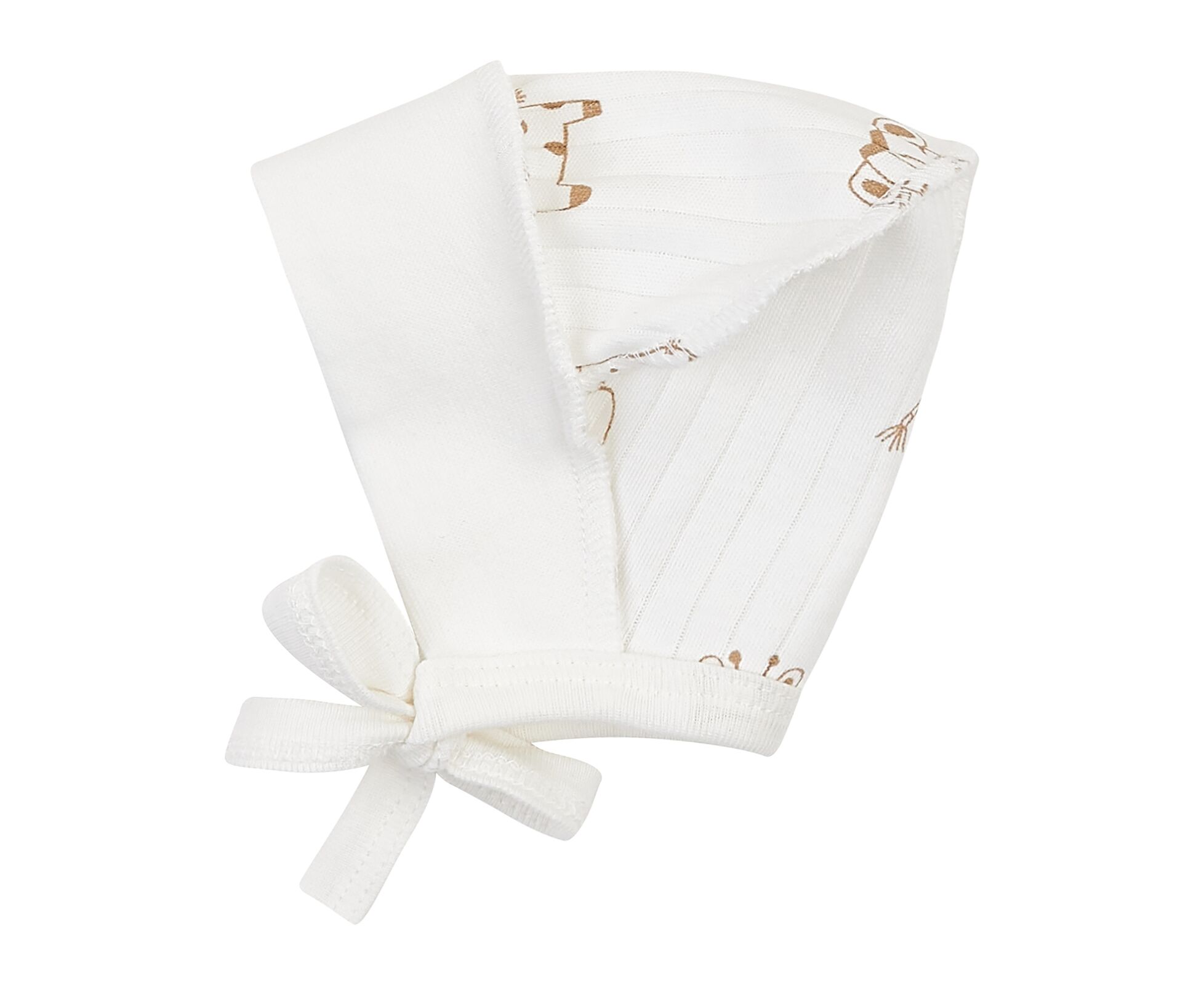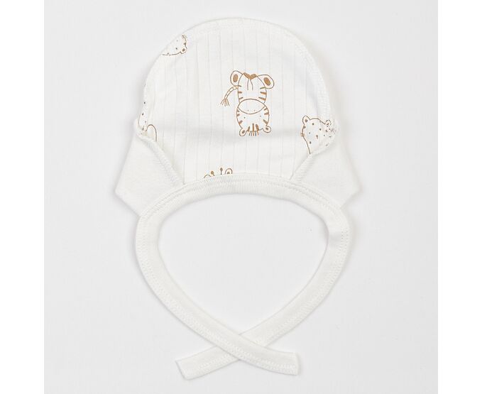 Чепчик для новонароджених із трикотажного бавовняного полотна із зав'язками під підборіддям. По лицьовому вирізу манжета з еластичного полотна, що забезпечує щільність прилягання виробу.. Шви виконані назовні, запобігаючи торканню зі шкірою малюка.