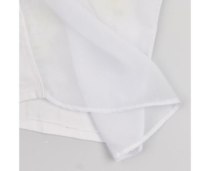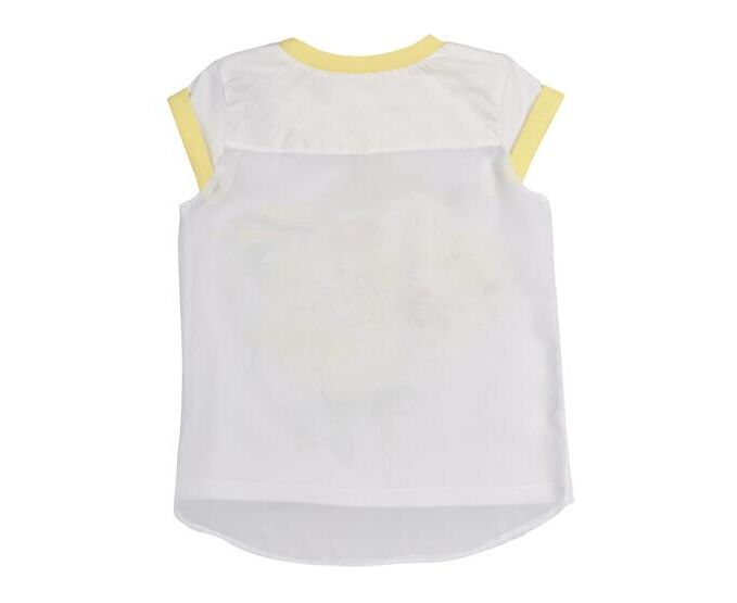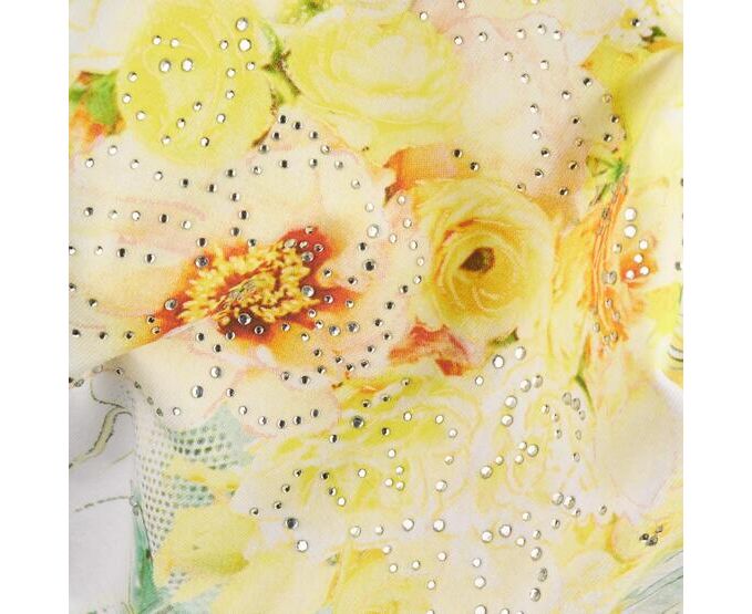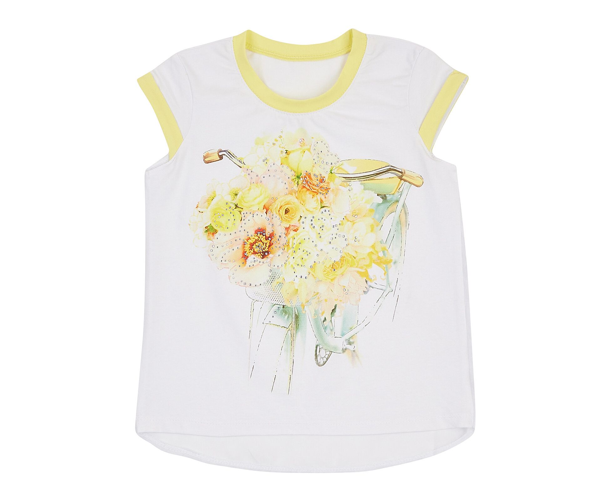 Стильна футболка для дівчинки, з якісного стрейч-куліру (97%бавовна 3%еластан), круглим вирізом горловини з пришивною планкою, та маленьким рукавом з манжетом-відворотом з полотна контрасного кольору. На переді друк, оздоблений стразами. Спинка з кокеткою та основною деталлю з білого шифону.