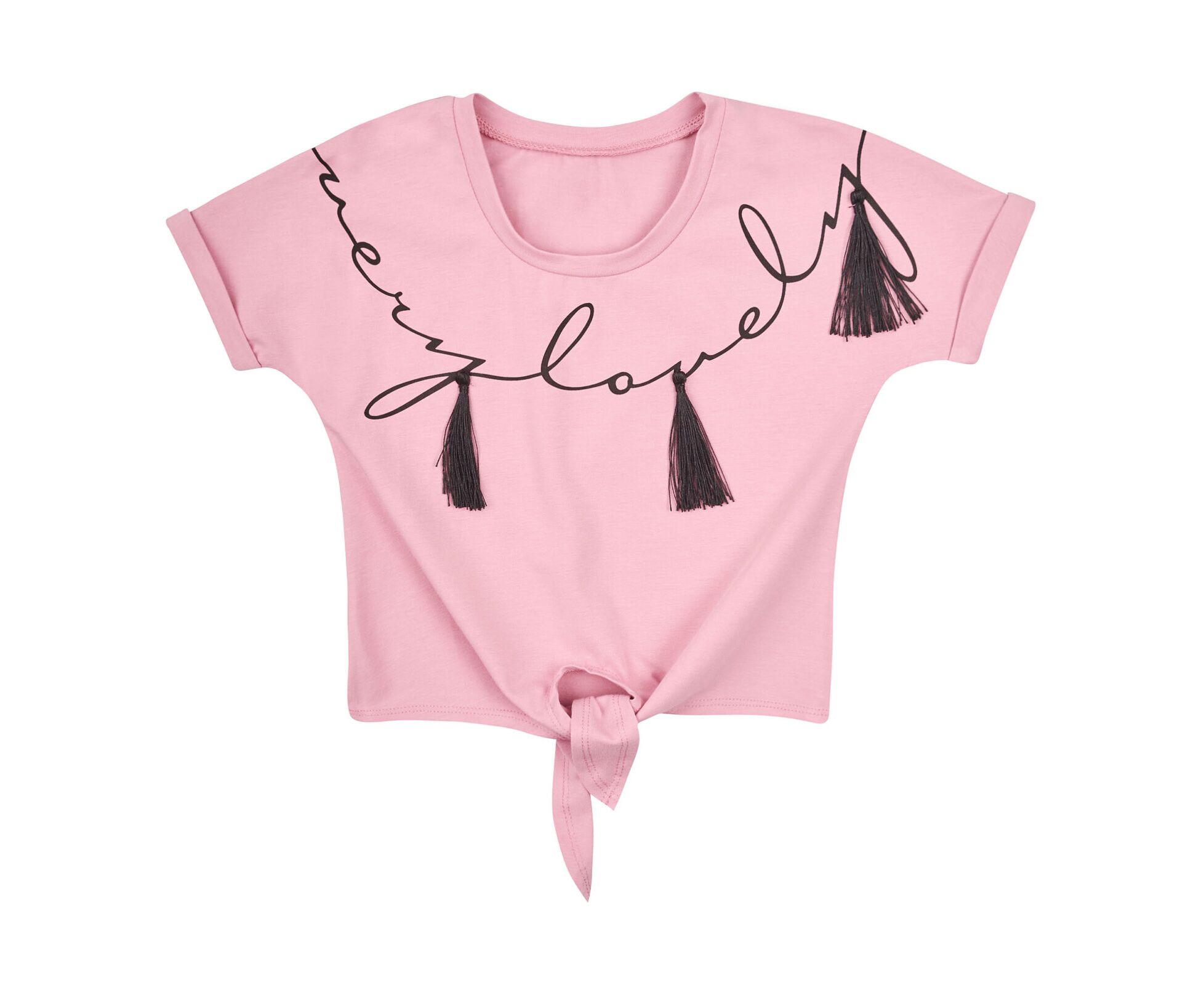 Футболка вільного крою з пудрового стрейч-куліру (97%бавовна 3%еластан) для дівчинки. Футболка з цільнокроєним рукавом, з відворотами по низу рукава, з зав'язками по низу виробу. Виріз горловини круглий , з пришивною планкою. На переді стильний друк з нашивками у вигляді пензликів-бахроми.