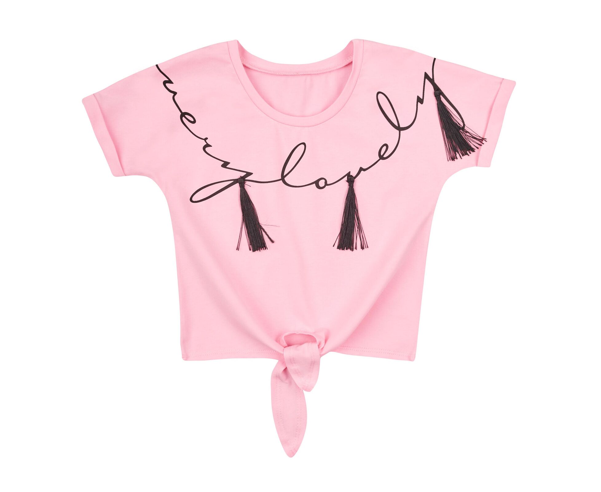 Футболка вільного крою з рожевого стрейч-куліру (97%бавовна 3%еластан) для дівчинки. Футболка з цільнокроєним рукавом, з відворотами по низу рукава, з зав'язками по низу виробу. Виріз горловини круглий , з пришивною планкою. На переді стильний друк з нашивками у вигляді пензликів-бахроми.
