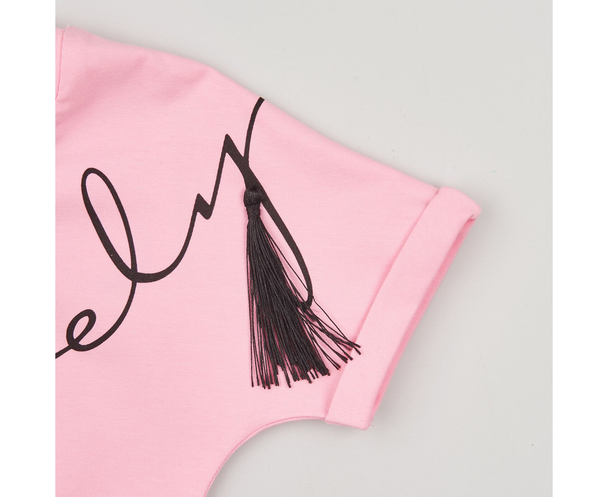 Футболка вільного крою з рожевого стрейч-куліру (97%бавовна 3%еластан) для дівчинки. Футболка з цільнокроєним рукавом, з відворотами по низу рукава, з зав'язками по низу виробу. Виріз горловини круглий , з пришивною планкою. На переді стильний друк з нашивками у вигляді пензликів-бахроми.