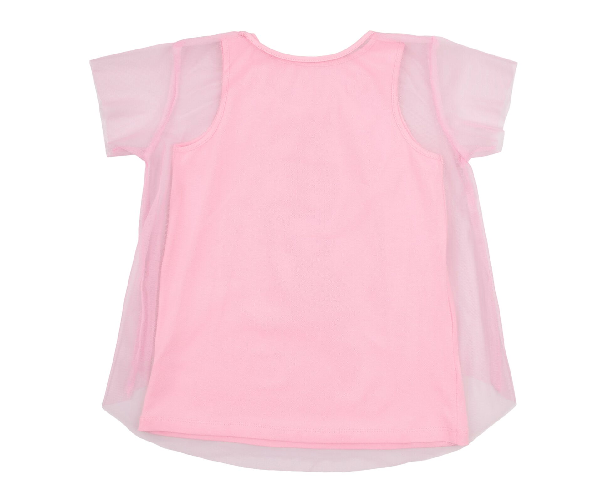 Комплект для дівчинки, з стрейч-кулірової майки та накидки з напівпрозорої євросітки. Майка з стильним принтом на переді, горловина та пройми окантовані руликом. Накидка вільного широкого крою, з необробленими зрізами. Круглий визір горловини окантований руликом.