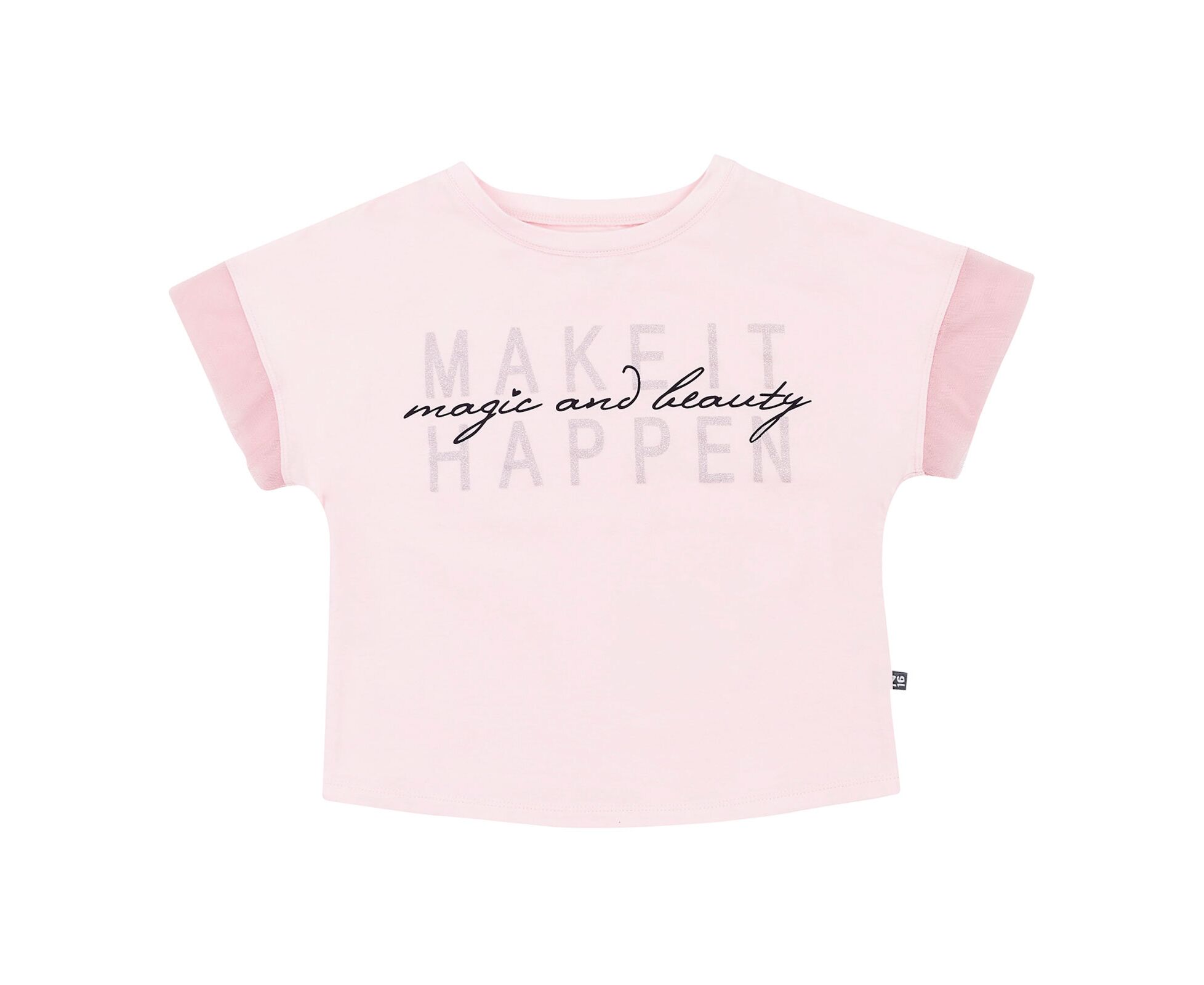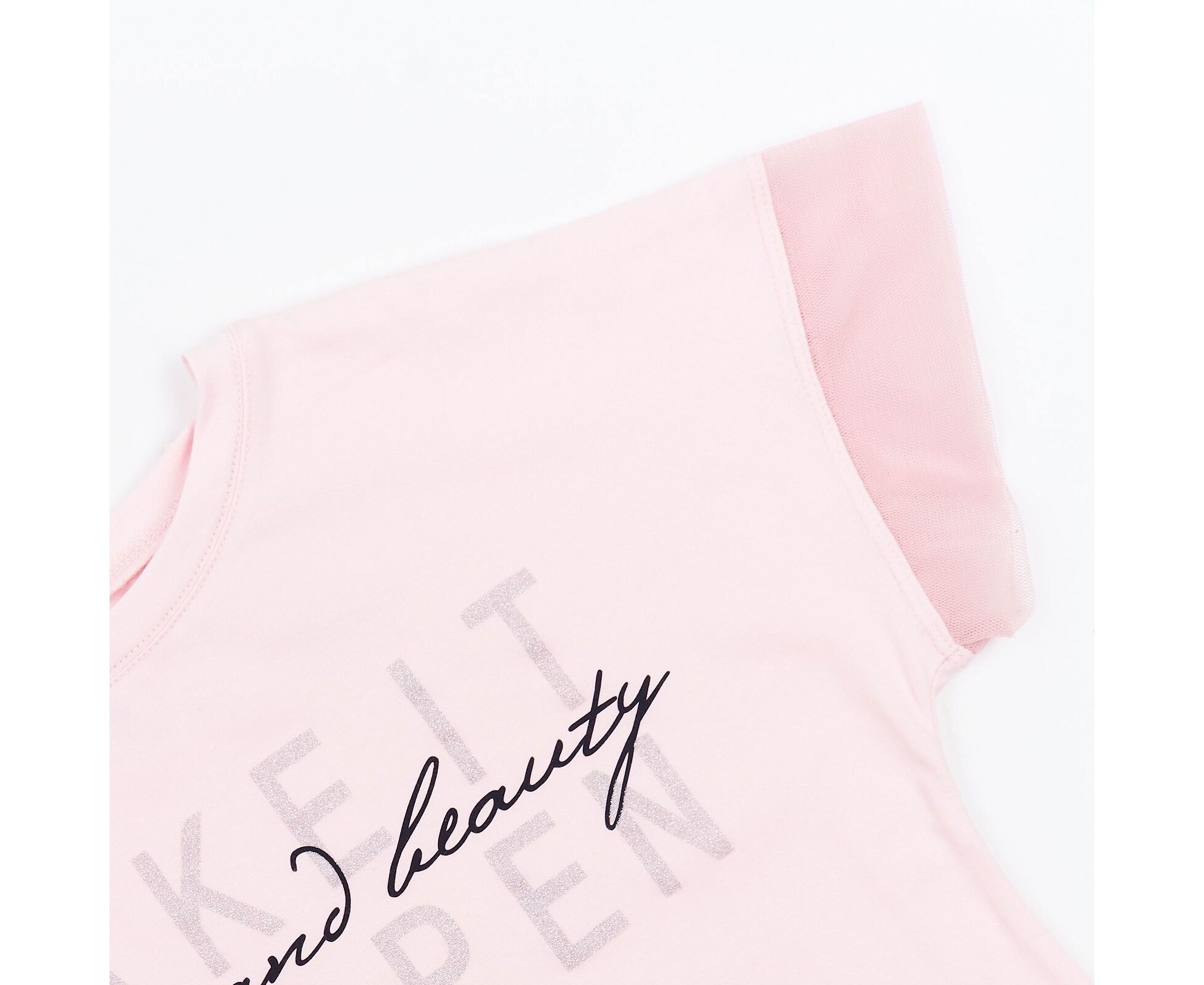 Футболка для дівчинки, з якісного стрейч-куліру, який добре тримає колір та форму навіть після багаторазового прання. Футболка зі стильним принтом з блискучими елементами на переді , з спущеним плечем та рукавом-рюшею з м'якої еластичної євросітки.