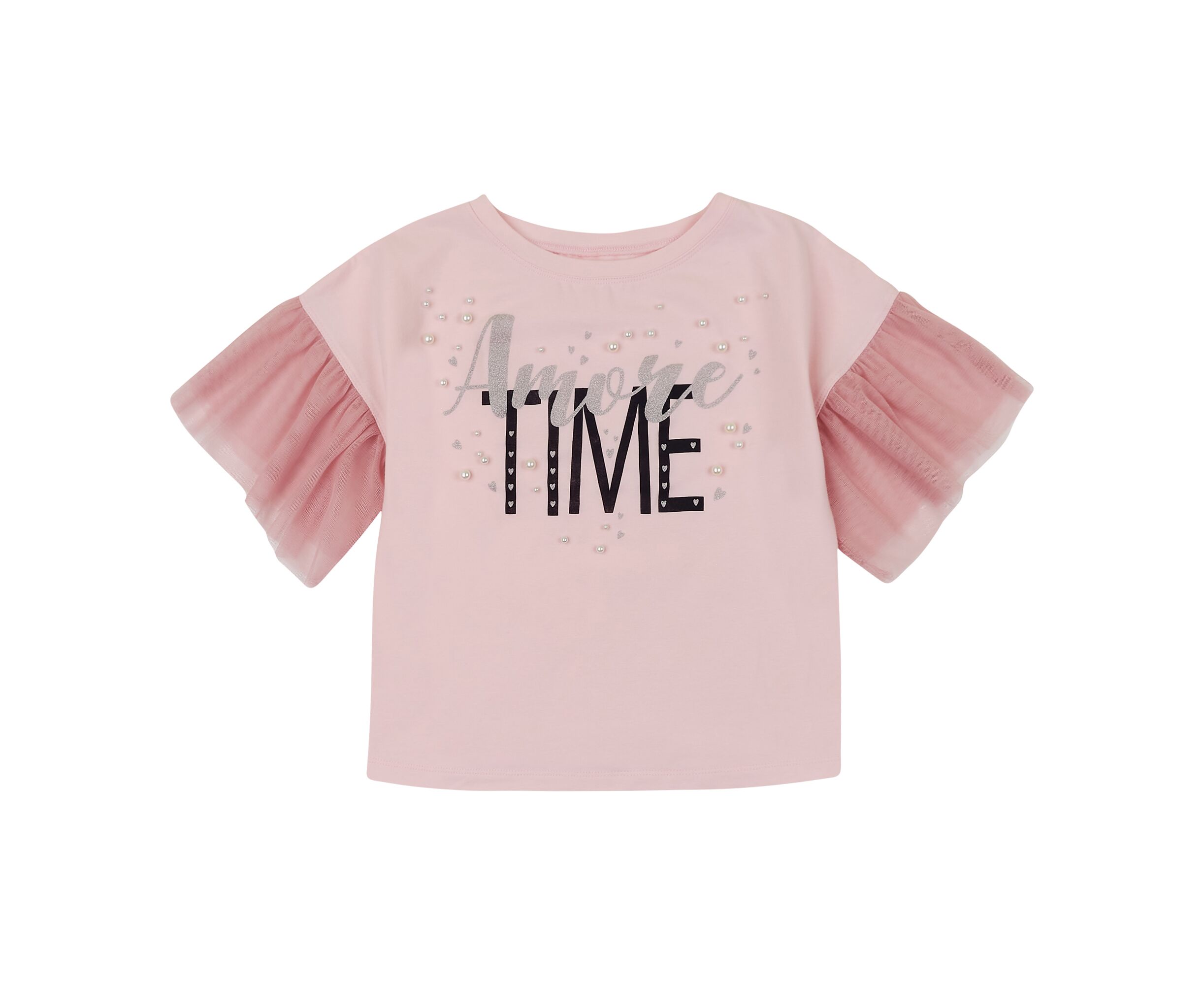 Футболка для дівчинки, з якісного стрейч-куліру, який добре тримає колір та форму навіть після багаторазового прання. Футболка зі стильним принтом з блискучими елементами та декоративними намистинками-перлинками на переді , з спущеним плечем та рукавом-рюшею з двох шарів м'якої еластичної євросітки.