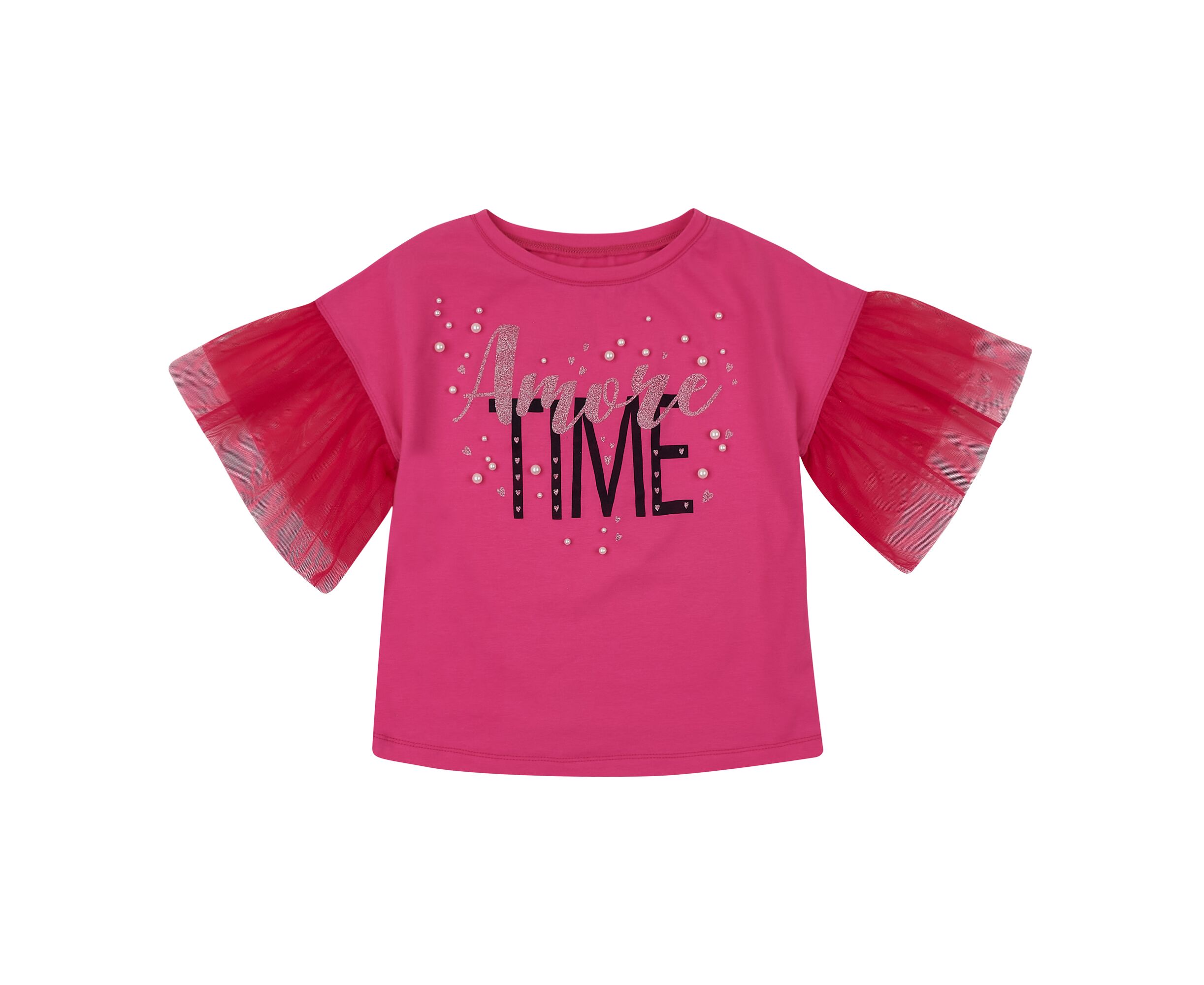 Футболка для дівчинки, з якісного стрейч-куліру, який добре тримає колір та форму навіть після багаторазового прання. Футболка зі стильним принтом з блискучими елементами та декоративними намистинками-перлинками на переді , з спущеним плечем та рукавом-рюшею з двох шарів м'якої еластичної євросітки.
