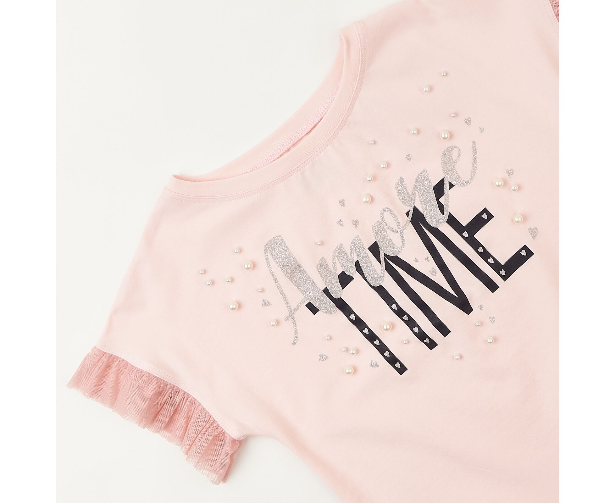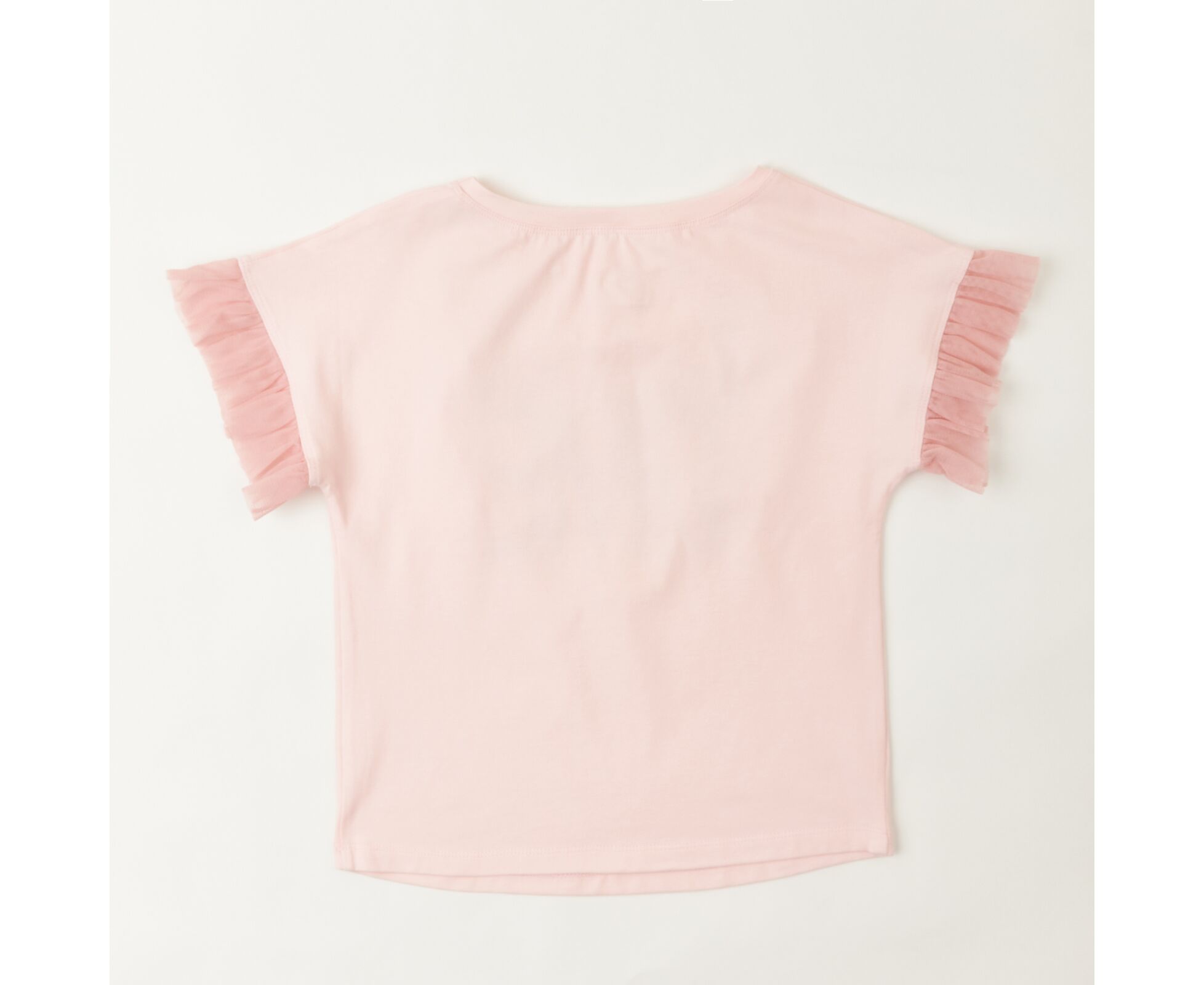Стильна футболка в романтичному стилі з бавовняної тканини з еластаном. Горловина лодочкою, по низу приспущеного цільнокроєного рукава повітряний рюш з двох шарів м'якої еластичної євросітки. На переді друк з сряблястими елементами, оздоблений намистинами-перлинами.