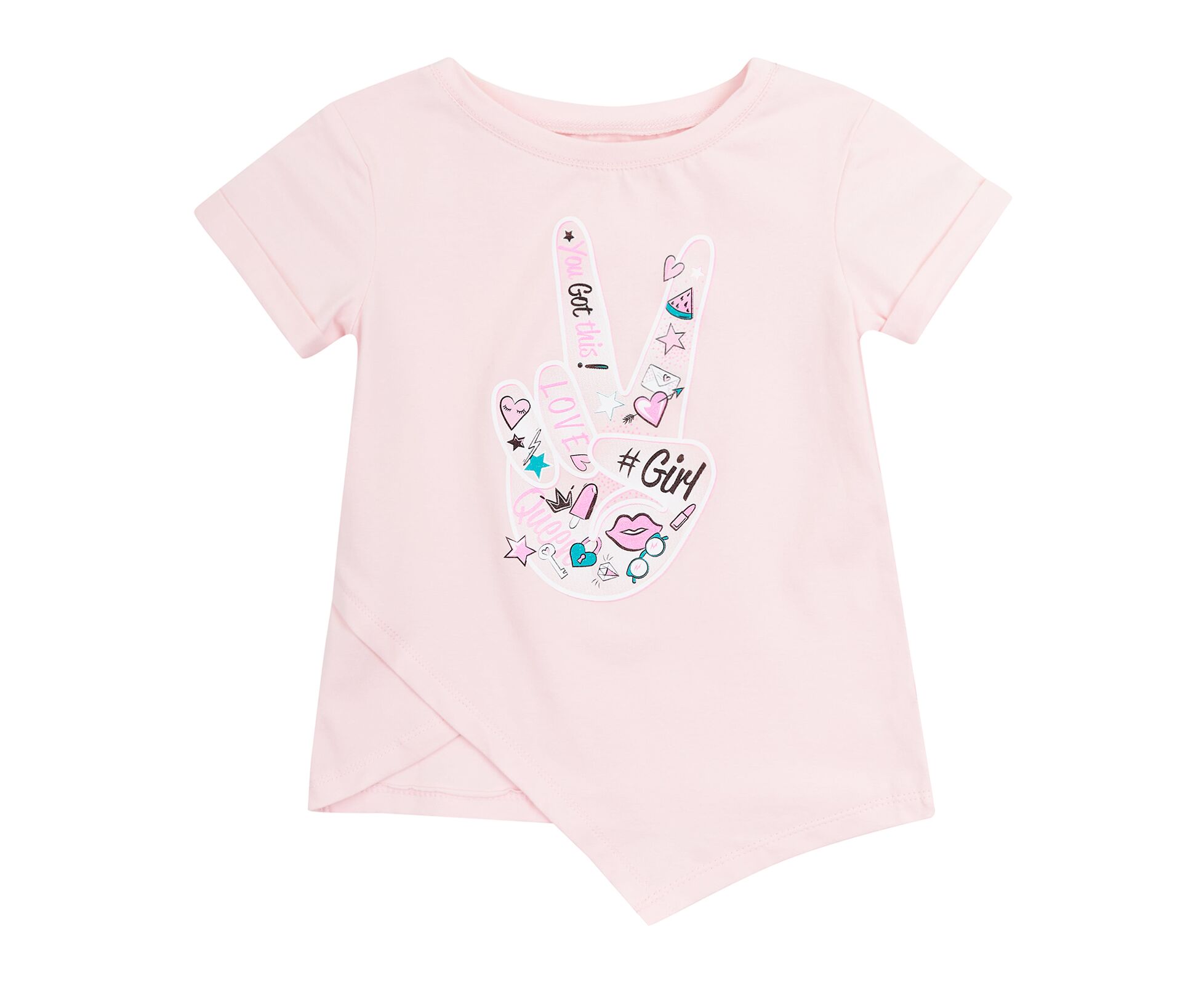Футболка для дівчинки, з якісного стрейч-куліру, який добре тримає форму та колір навіть після багаторазового прання. Футболка з асиметричним підрізом та яскравим принтом на переді, Рукав з відворотом по низу, горловина лодочкою.