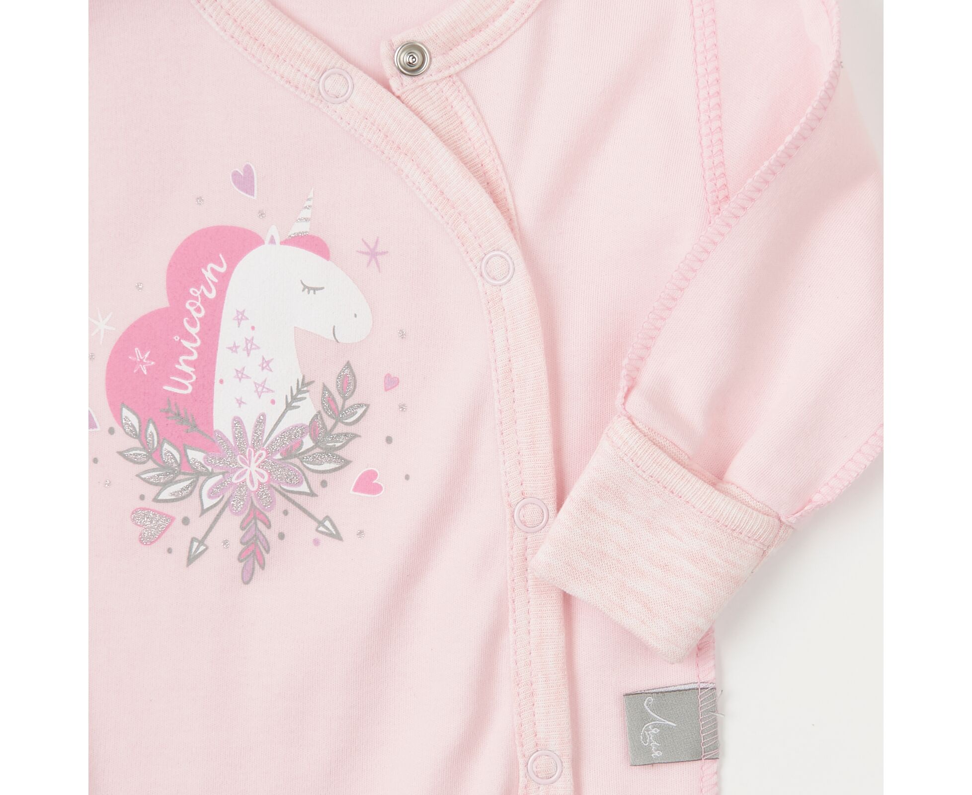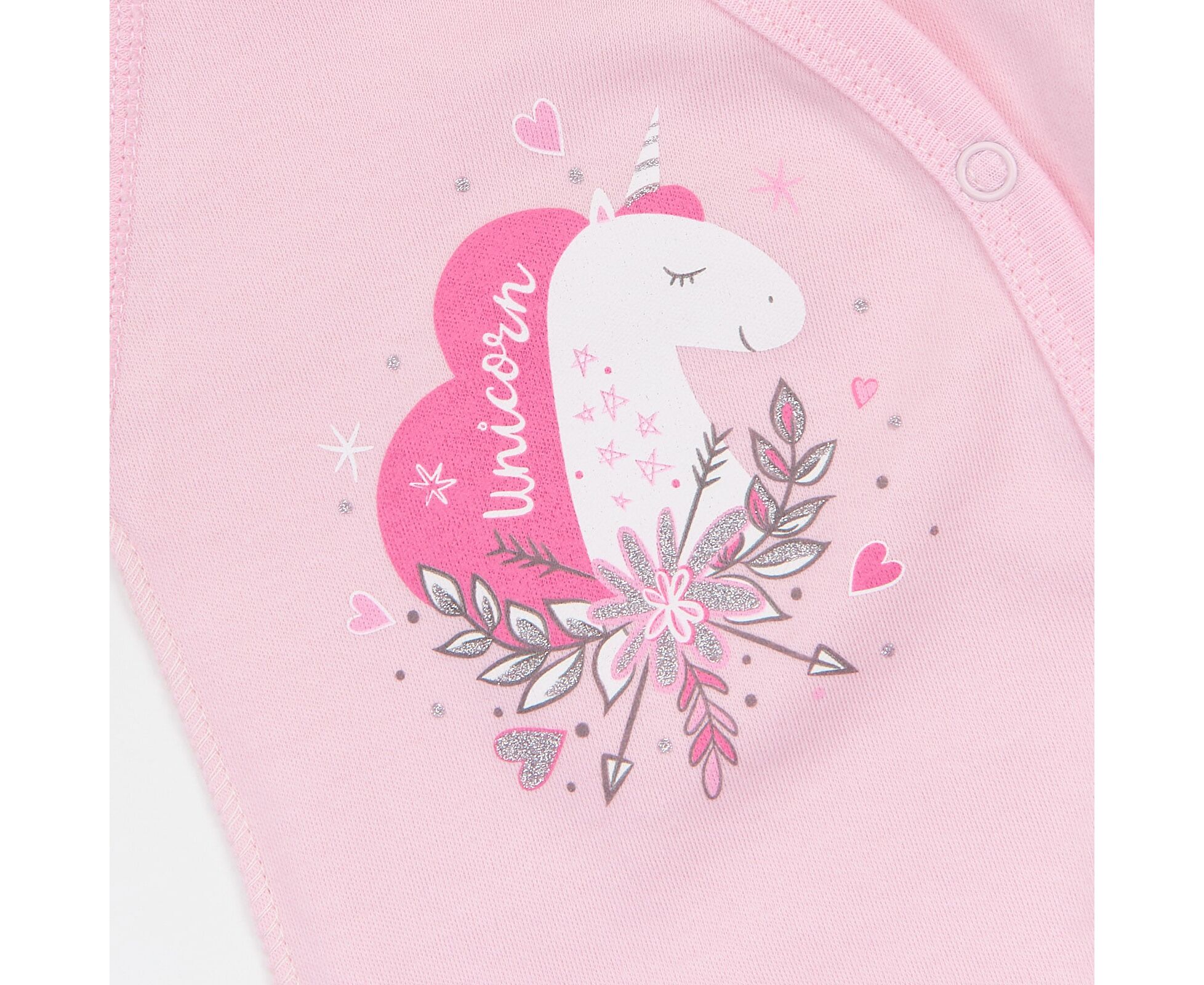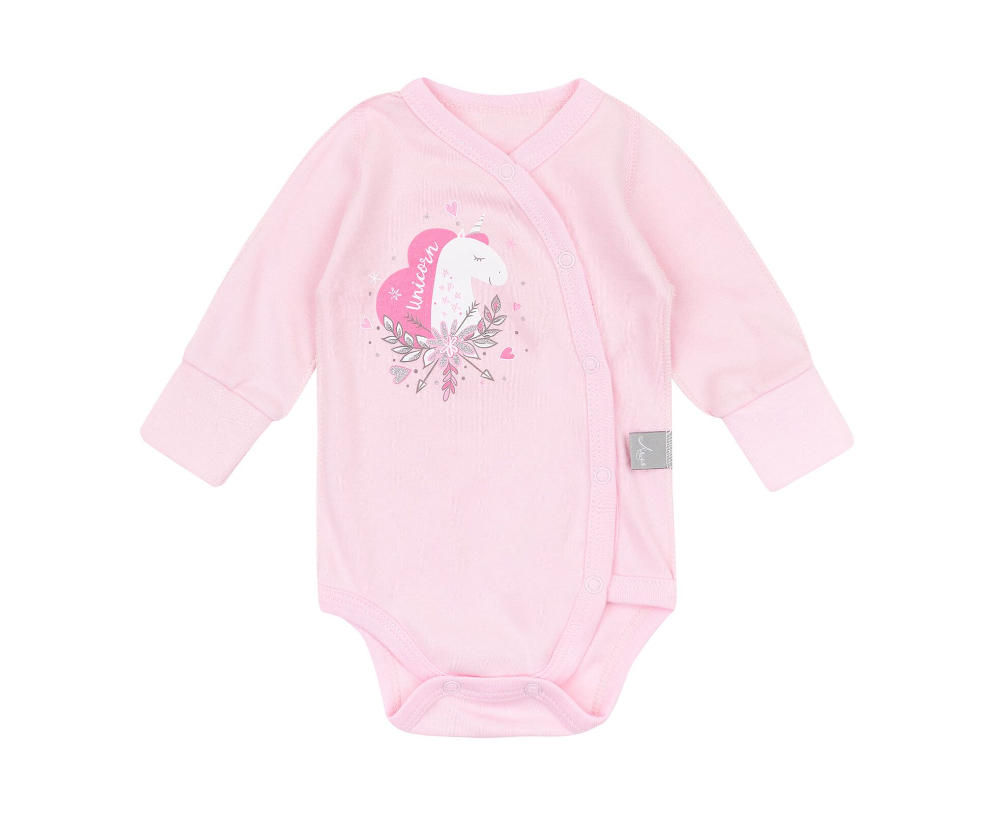 Дівочий боді з довгим рукавом, з наздвичайно якісного, приємного на дотик, натурального інтерлока. Застбіка асиметрична по переду на кнопки та між ніжками. Перед прикрашений стильним друком, Зрізи оброблені окантовкою з бавовняної рібани. Рукав з манжетами з еластичного полотна.